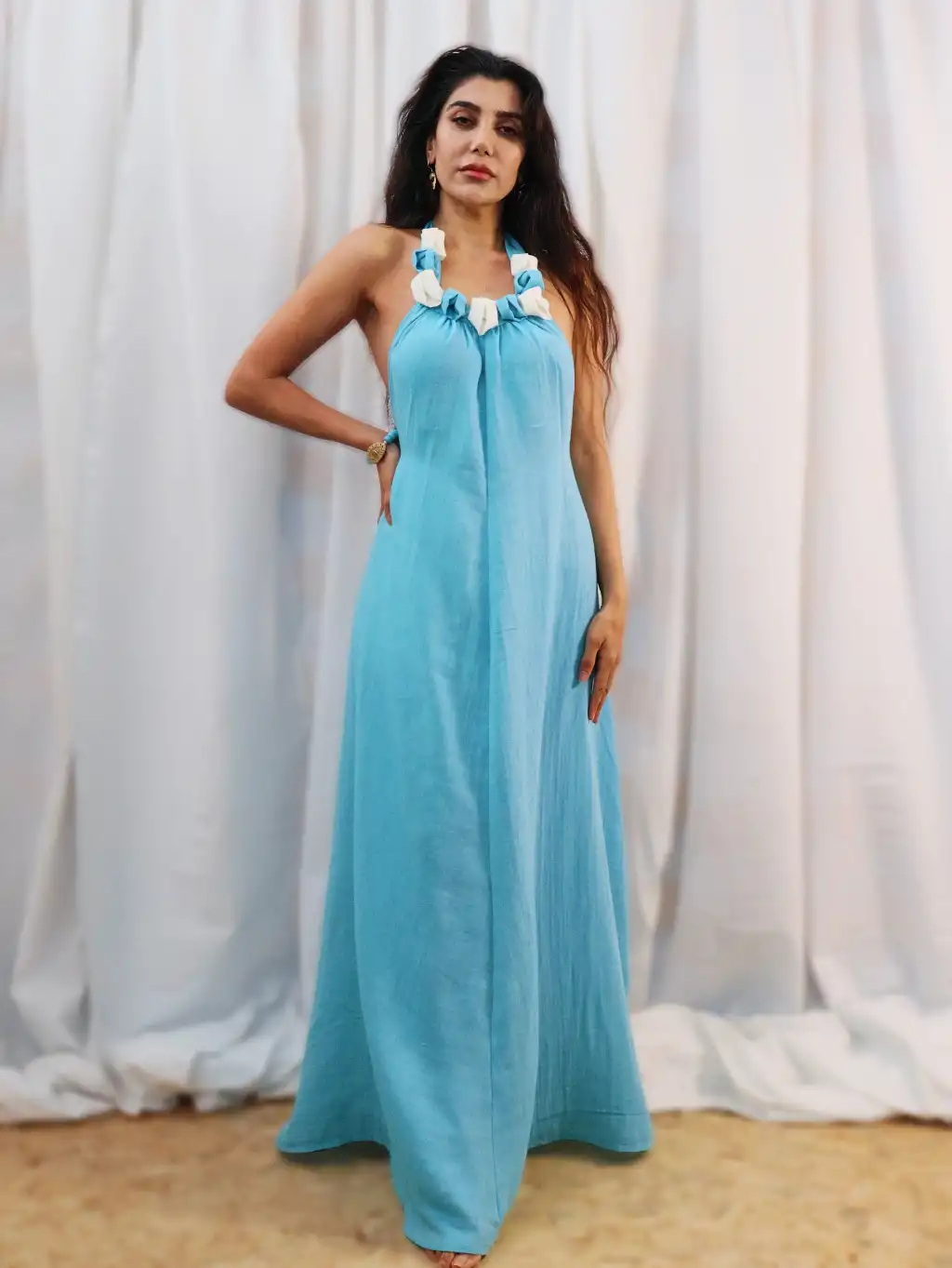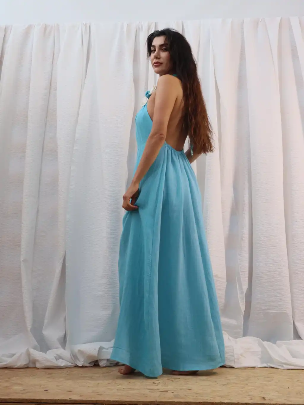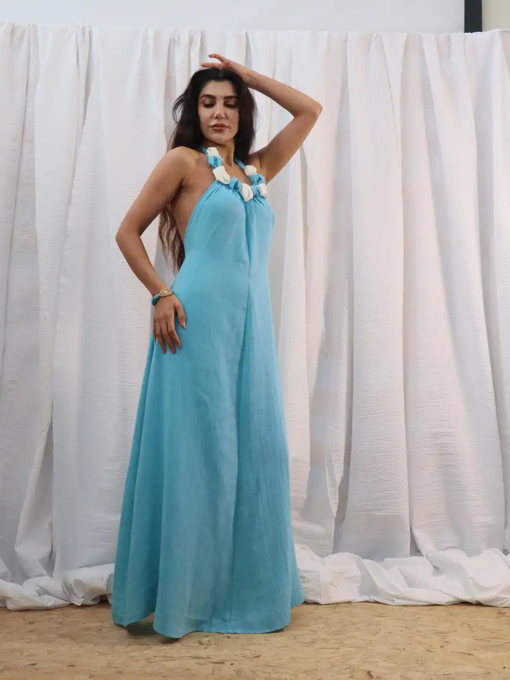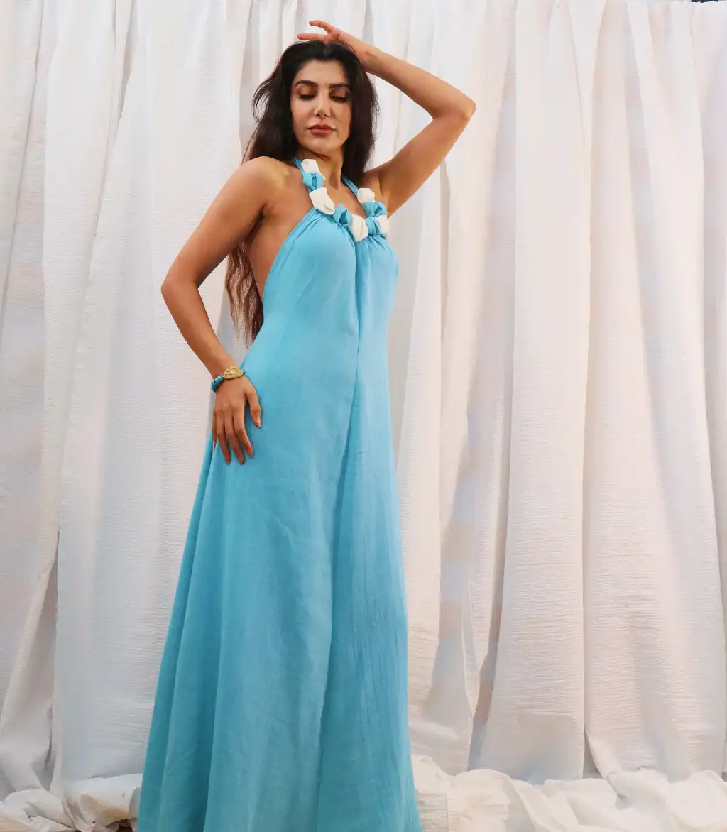 El işi Yaka Detylı Pamuk Müslin Sırt Dekolteli Maksi Elbise