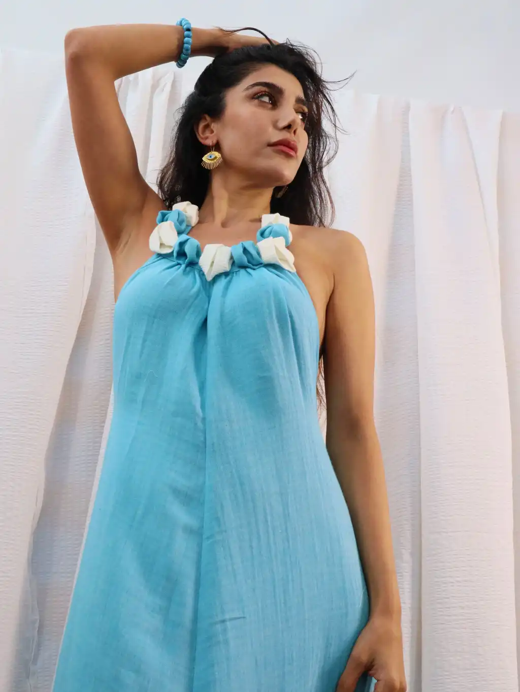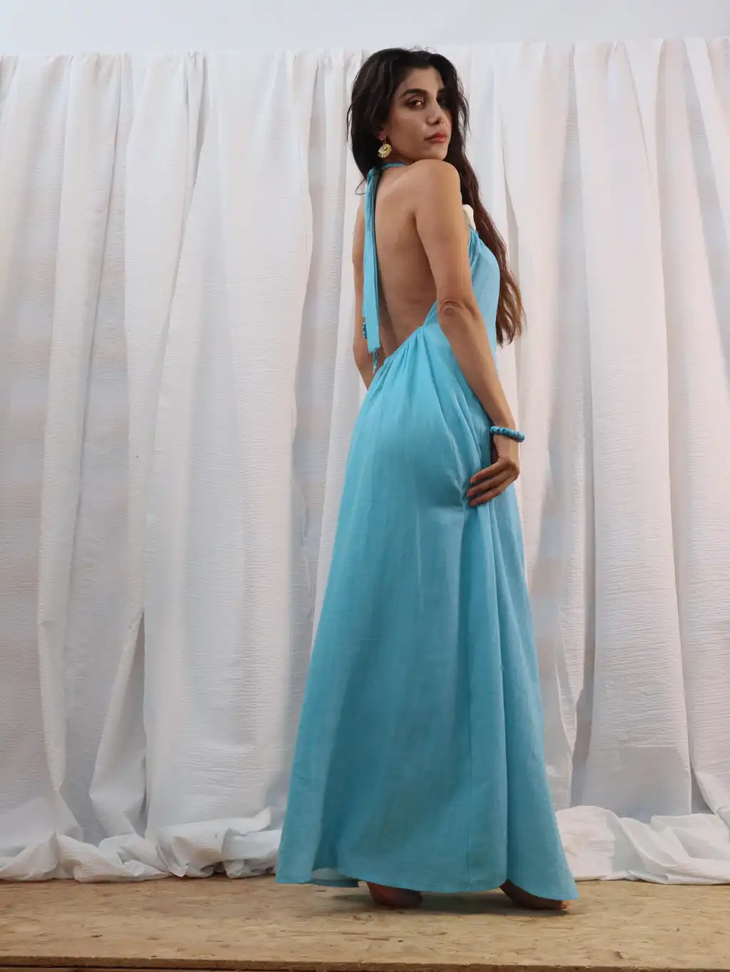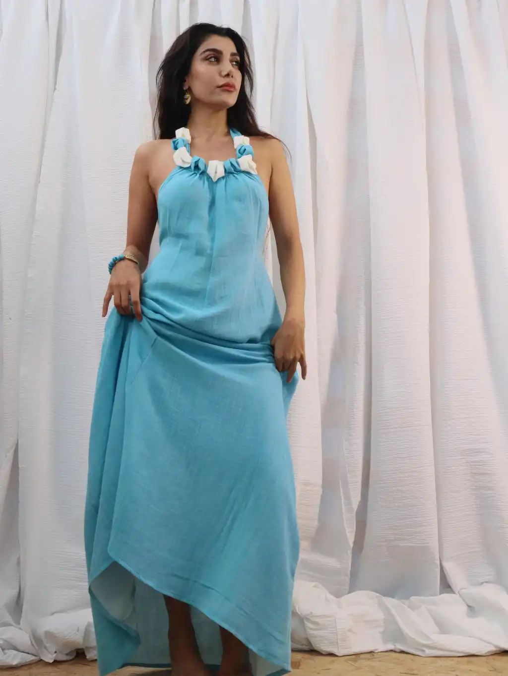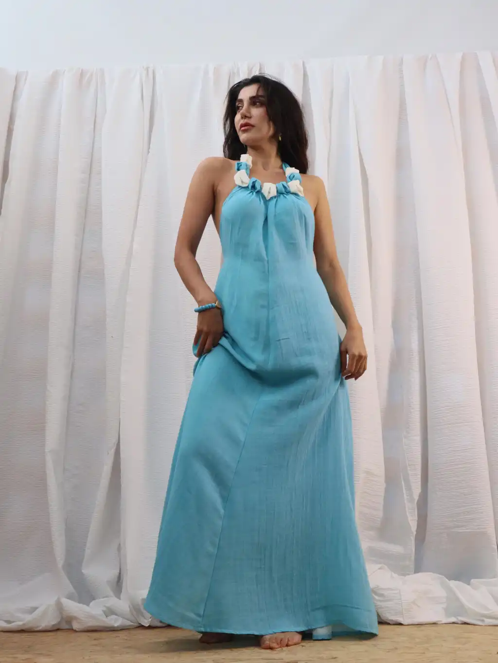 El işi Yaka Detylı Pamuk Müslin Sırt Dekolteli Maksi Elbise
