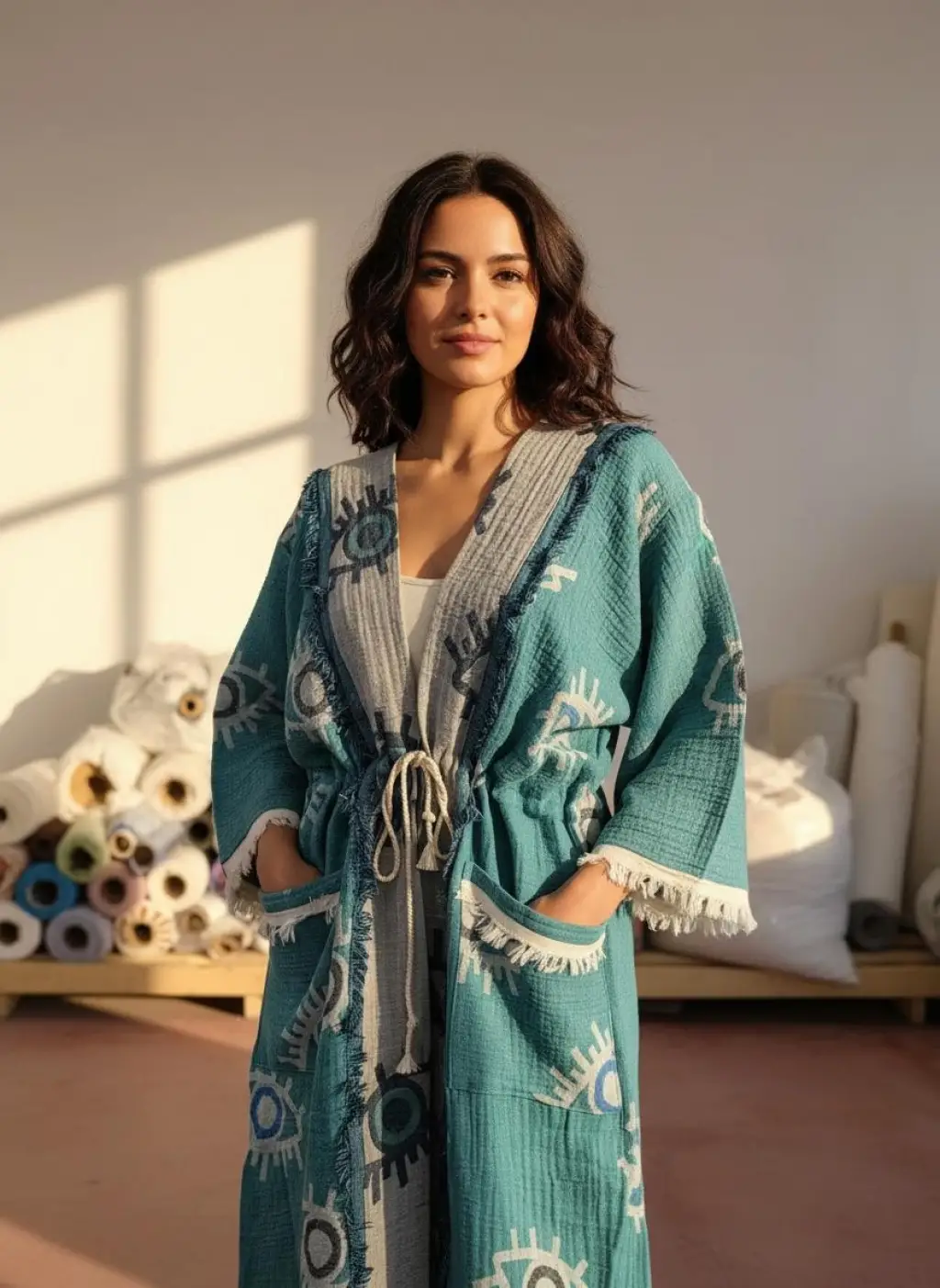 ASENA PAMUK ŞİLE BEZİ FIRFIRLI BOHO KAFTAN