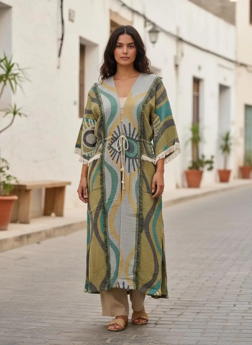 ASENA PAMUK ŞİLE BEZİ FIRFIRLI BOHO KAFTAN