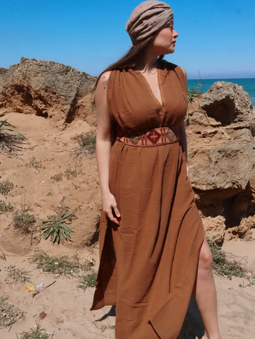 kilim kemer detaylı bohem müslin elbise