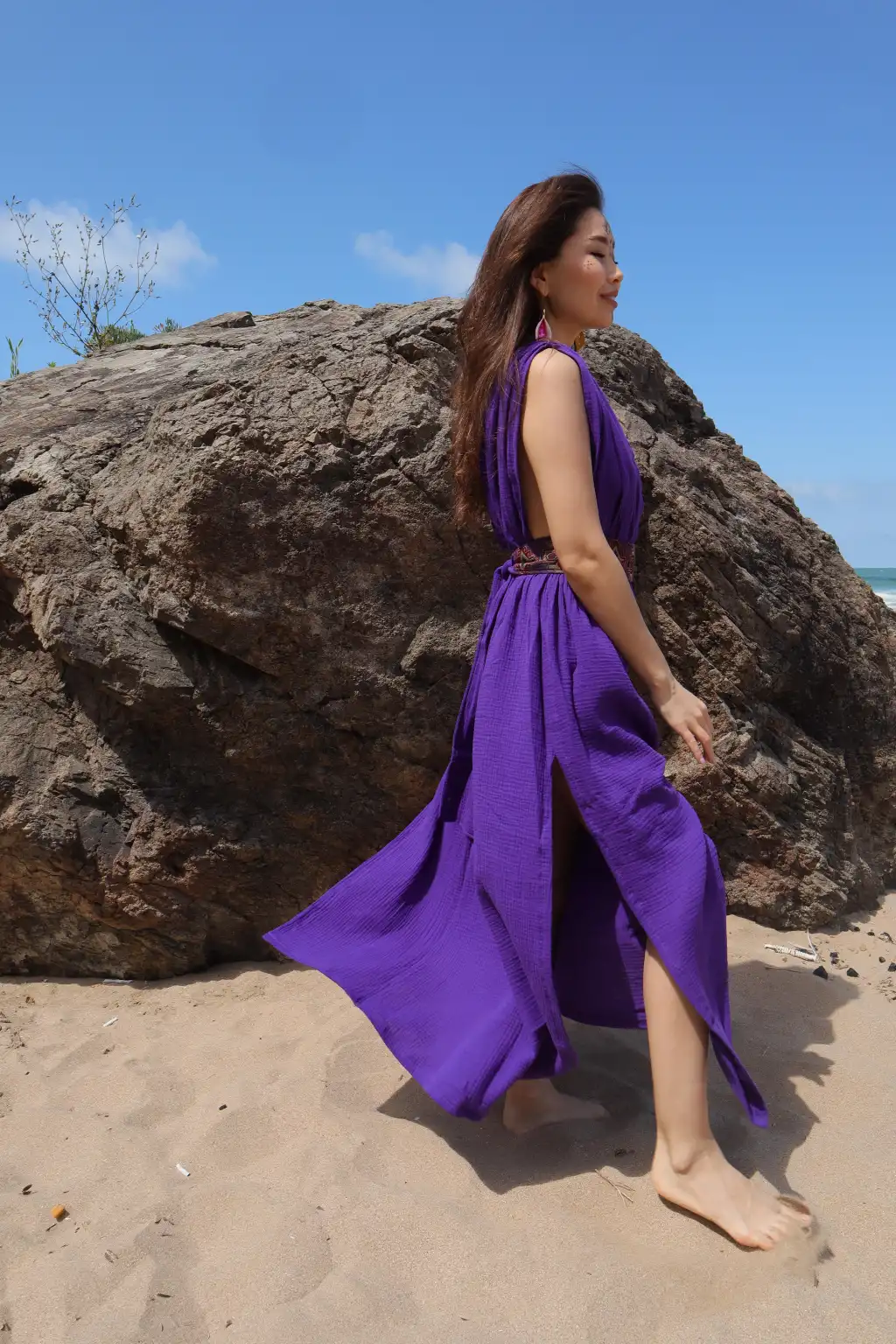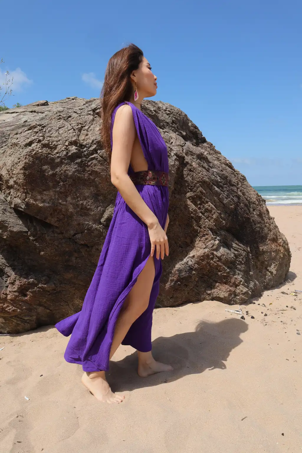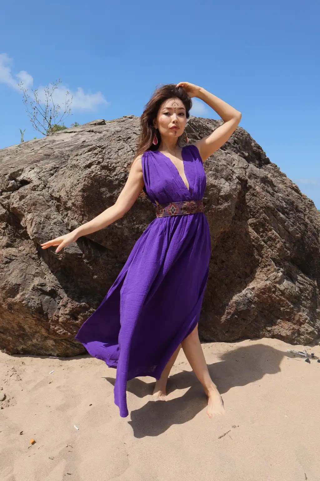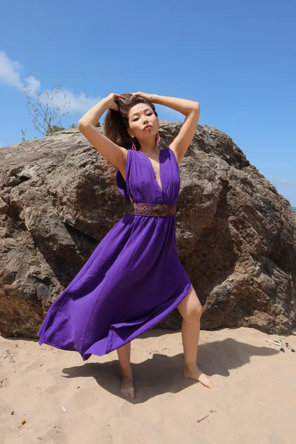 Geniş beden aralığına olan oversize kesimi ve pamuk kilim kemeri ile öne çıkan Pamuk müslin elbisemiz,