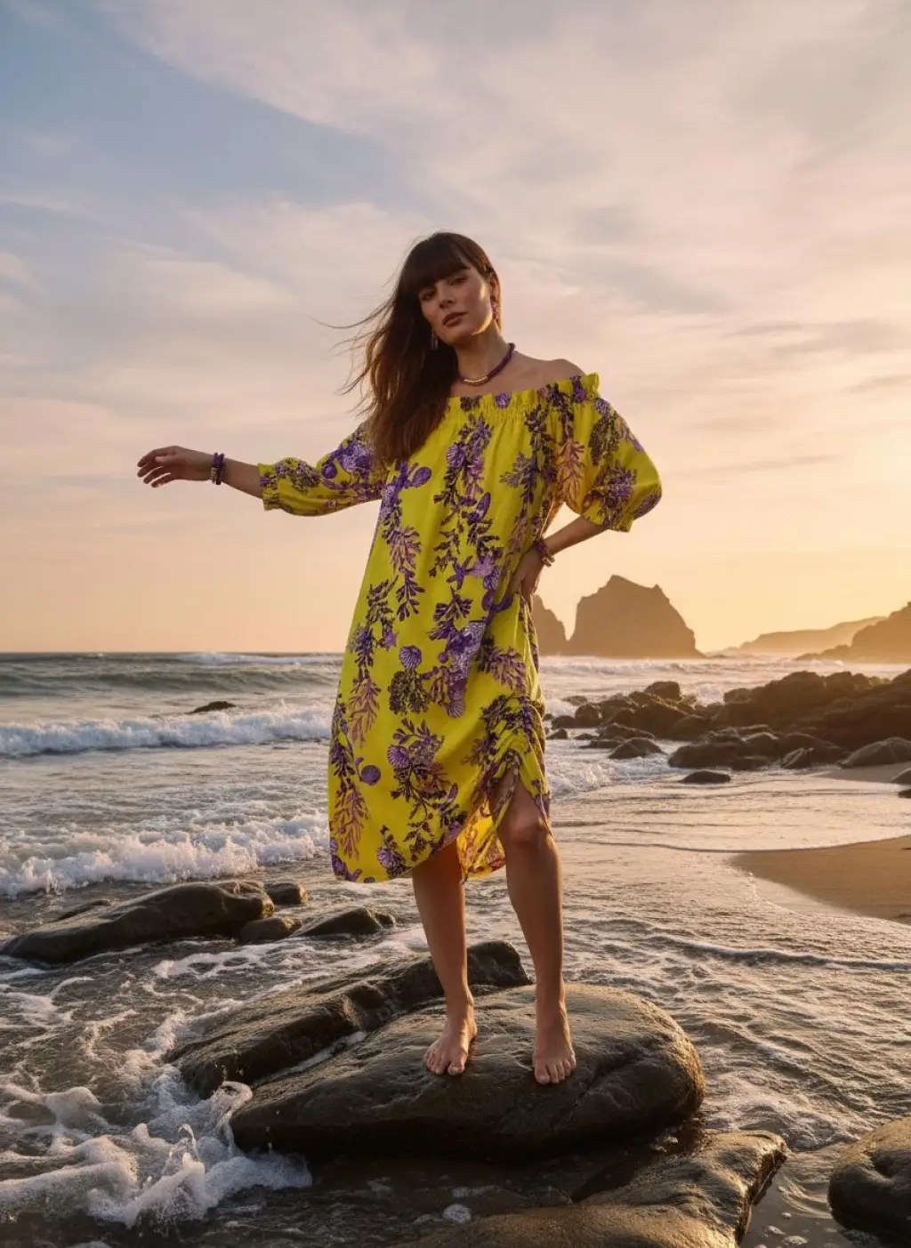 Lastikli Omuzları, serin tutan doğal viskon kumaşı ve etek boyu büzgü ile kısalabilen modeli ile tropikal bir esinti BALİ ile geliyor.