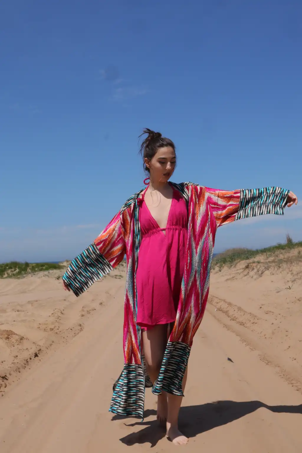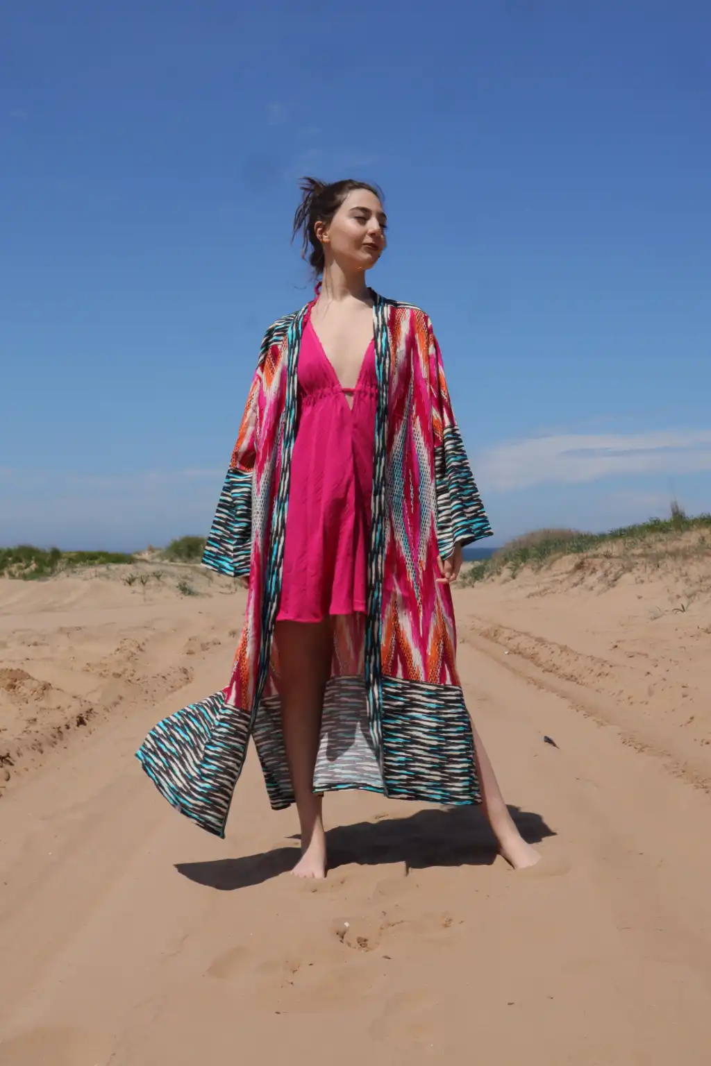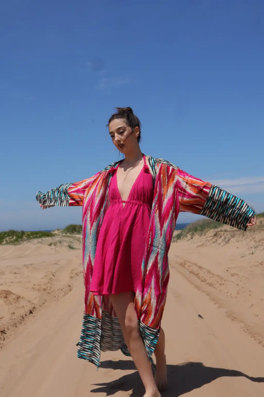 Buhara Etnik Baskılı Kaftanımız, tiril tiril dökümlü kumaşı ile terletmez, efsane renkleri ve deseni ile enerjinizi yükseltir.