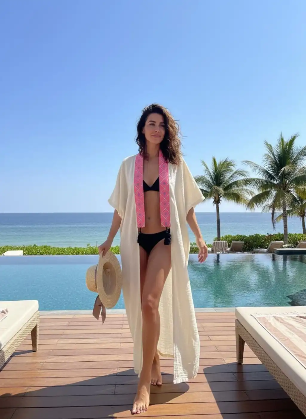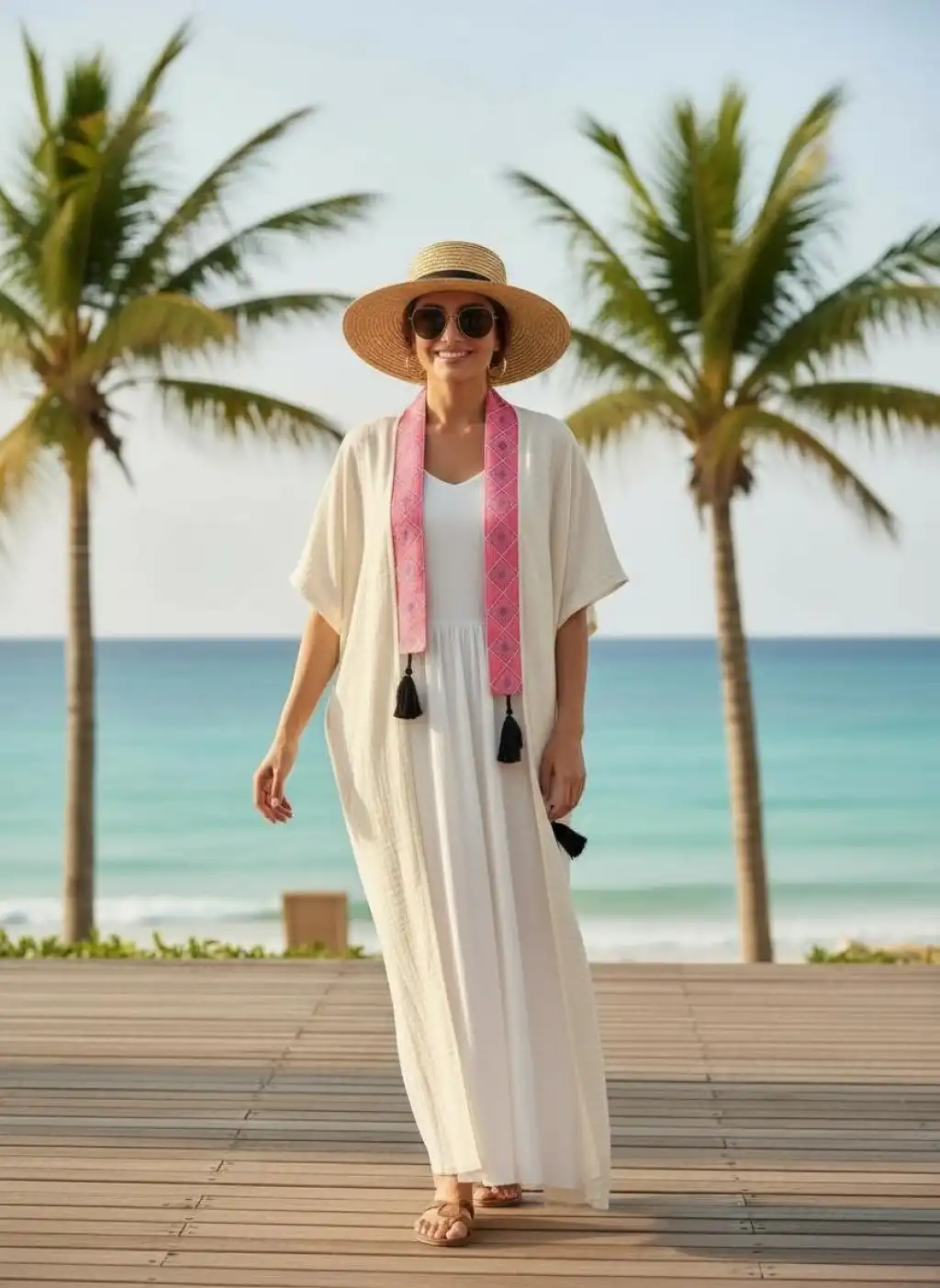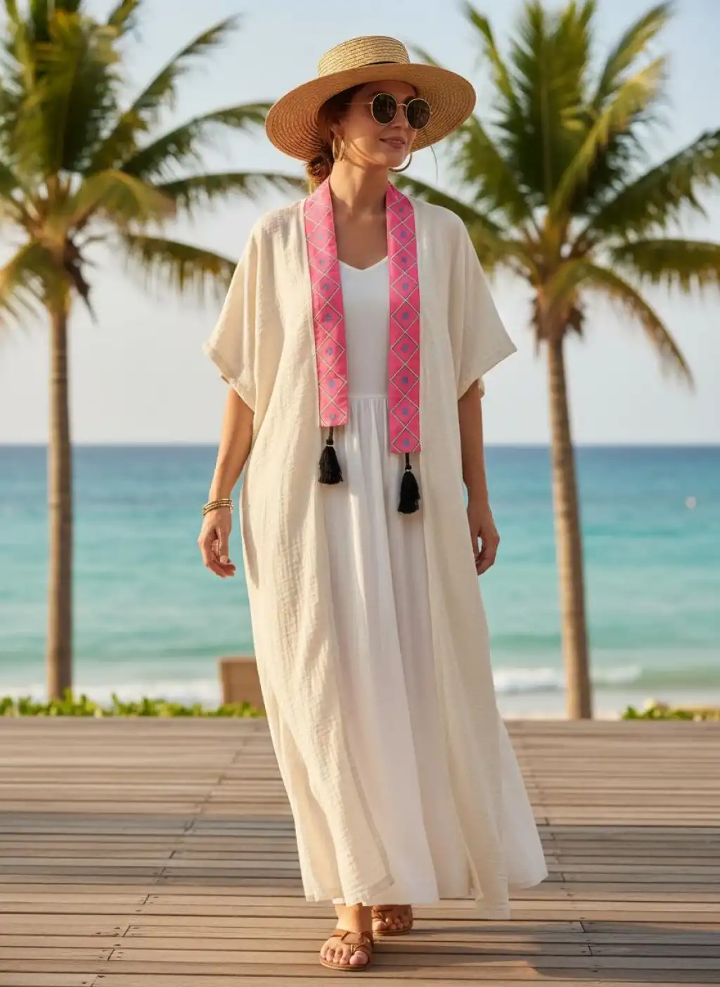 Doğal müslin kumaş ve çarpıcı pembe etnik bordür ile fark yaratan bu uzun kimonomuz