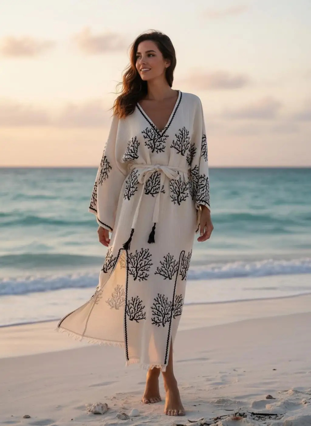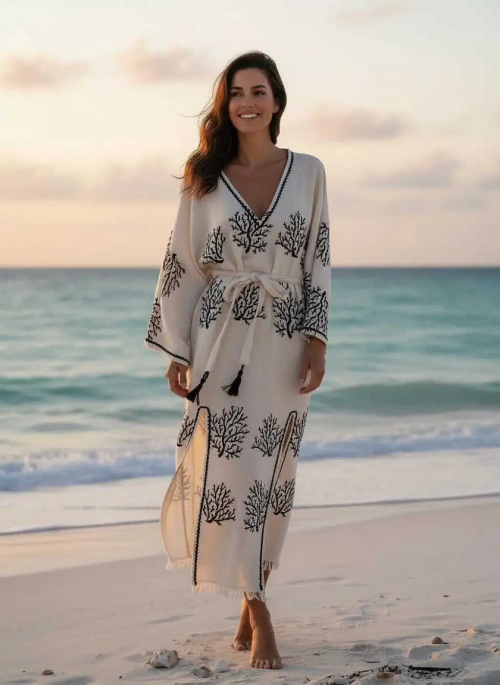 Doğal pamuk krinkil dokuma,mercan baskı detaylı CORAL 44 bedene kadar olmaktadır.