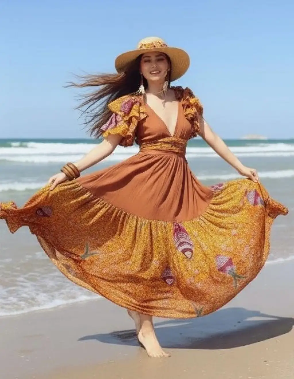 AZİZE BOHEM STİL MÜSLİN ELBİSE / Tarçın