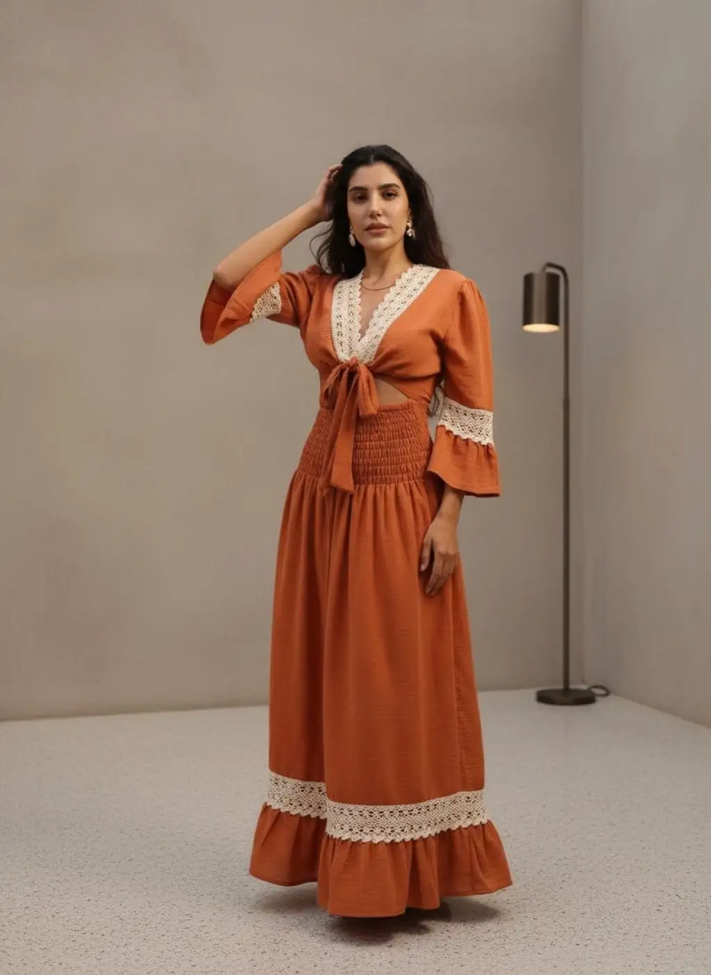 AZİZE BOHEM STİL MÜSLİN ELBİSE / Vintage Turuncu