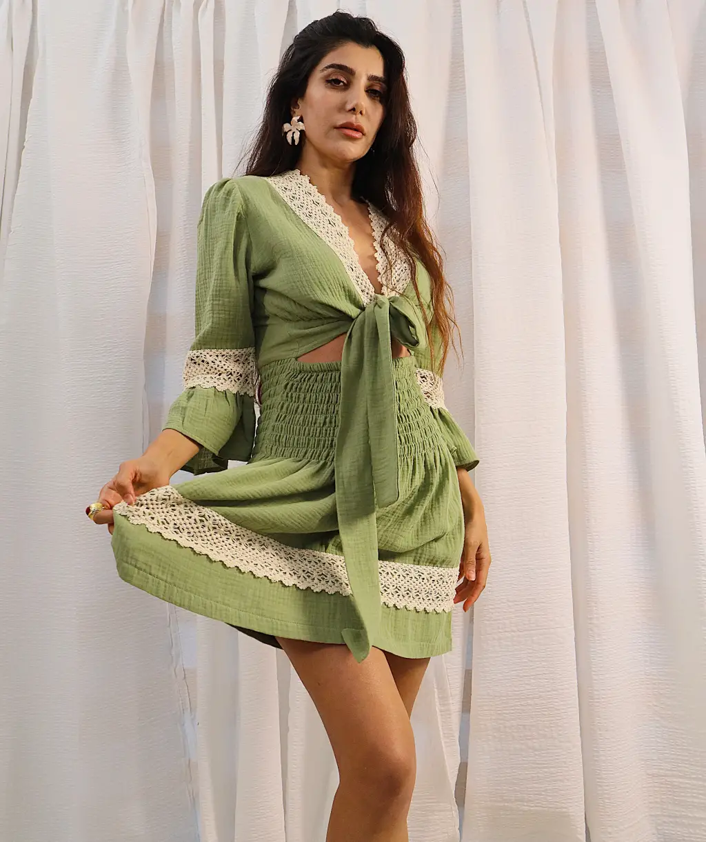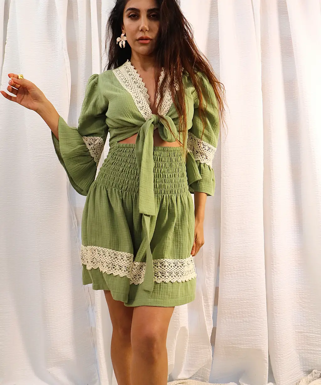 ENDÜLÜS DANTEL DETAYLI CROP BAĞLAMALI BOHEM MÜSLİN Mini ELBİSE