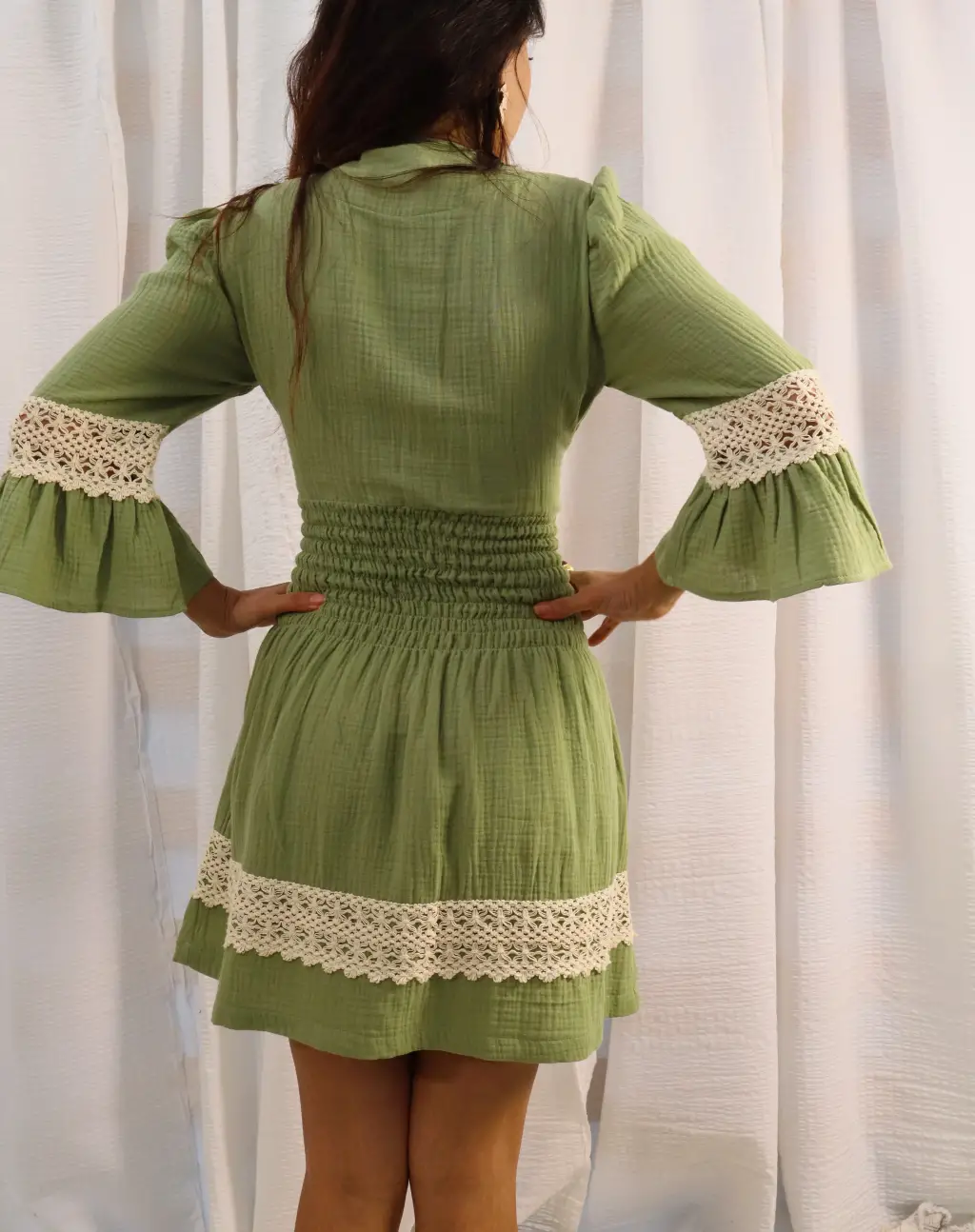 ENDÜLÜS DANTEL DETAYLI CROP BAĞLAMALI BOHEM MÜSLİN MİNİ ELBİSE