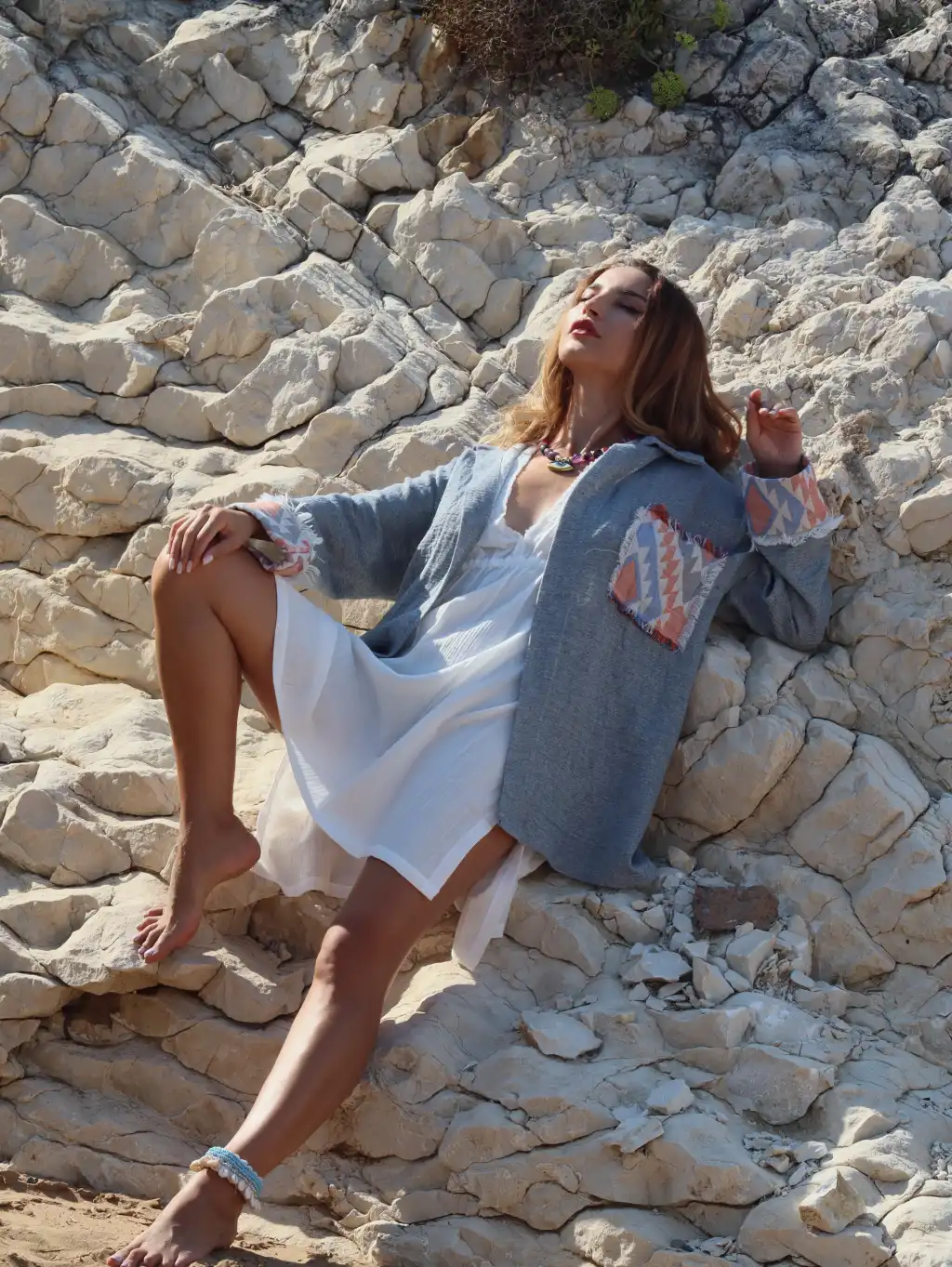 Epic kolları ve sırtı etnik detaylı çıtçıtlı gömlek serin yaz akşamlarında veya ilkbaharda doğallıktan vaz geçmek istemeyenler için