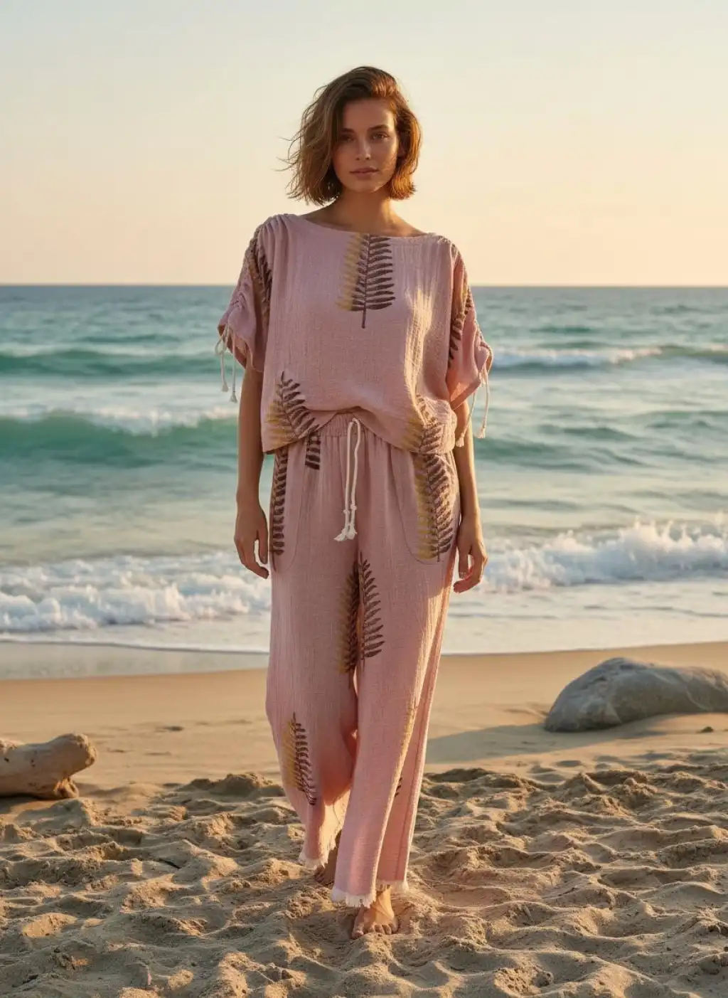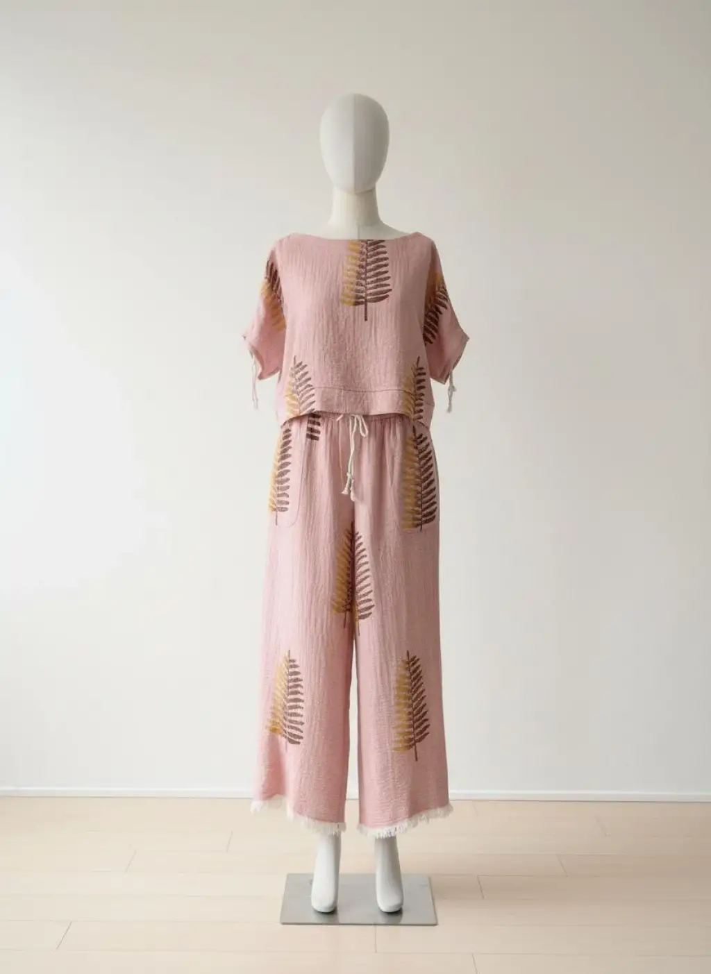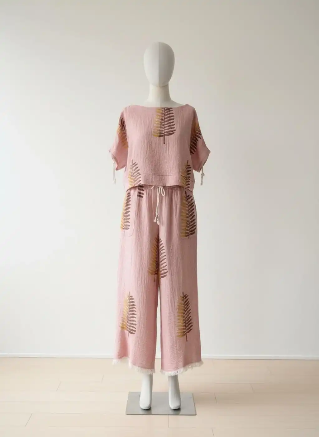 El Baskılı yaprak deseni, ymuşacık krinkil dokusu ile doğal ve nefes alan bir takım