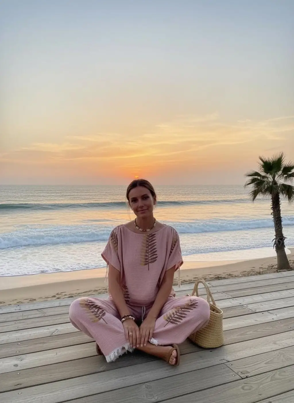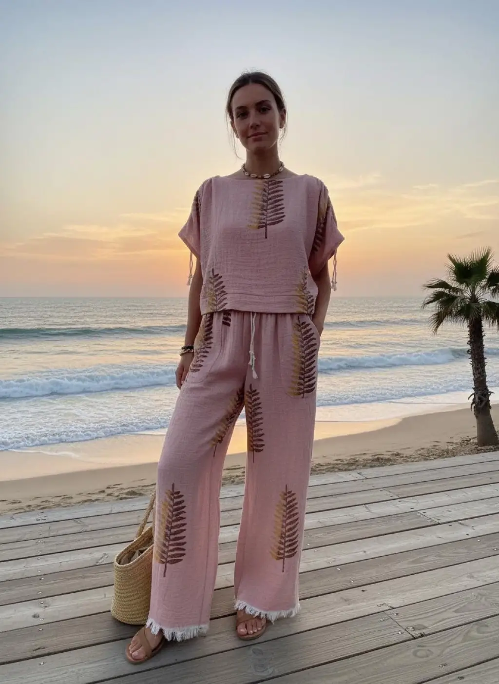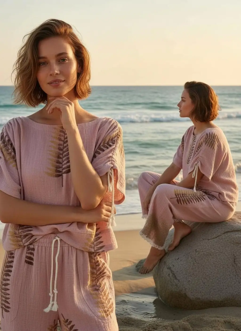 El Baskılı yaprak deseni, ymuşacık krinkil dokusu ile doğal ve nefes alan bir takım