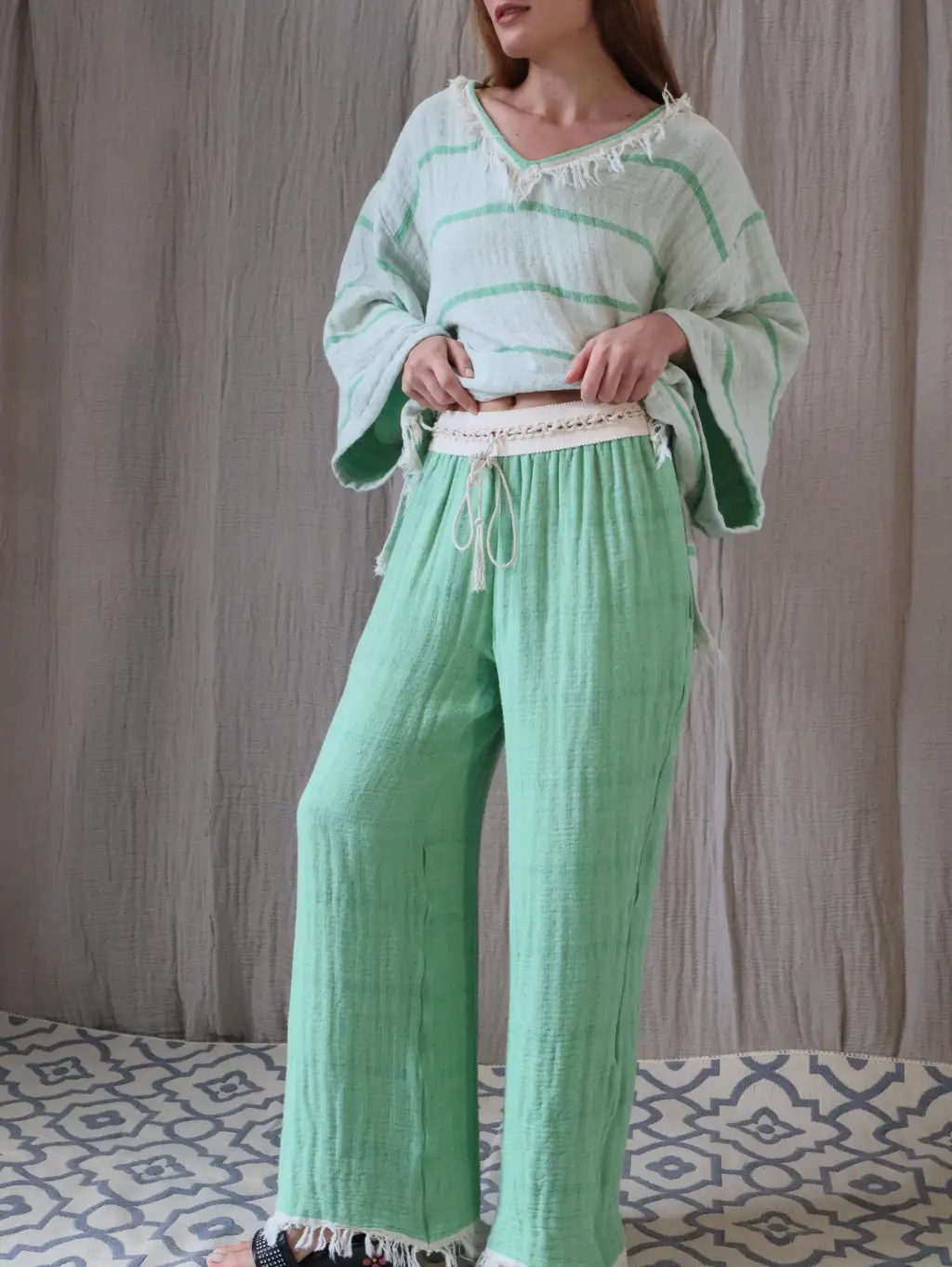 36 / 42 beden aralığına olan standart kalıp, yumuşacık ve %100 pamuk 4 kat müslin