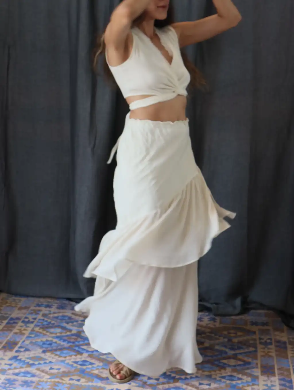 Vual Kumaş Detaylı Anvelop Kesim Etek ve Bağlamalı Crop Takım