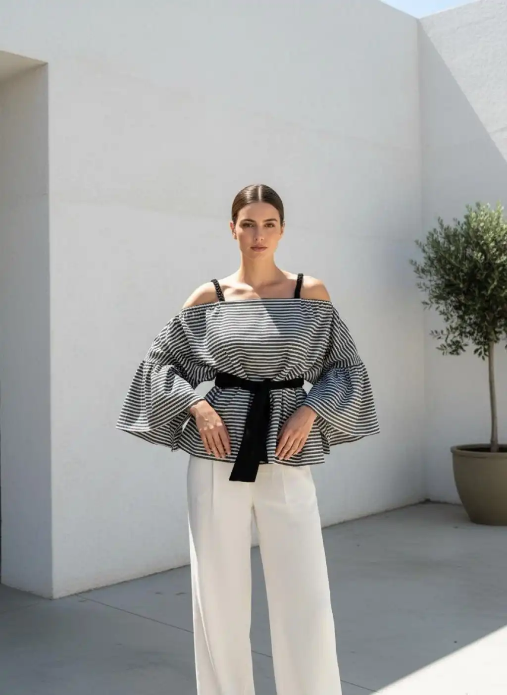 Kolları volanlı omuzdan askılı pamuk çizgili bluz