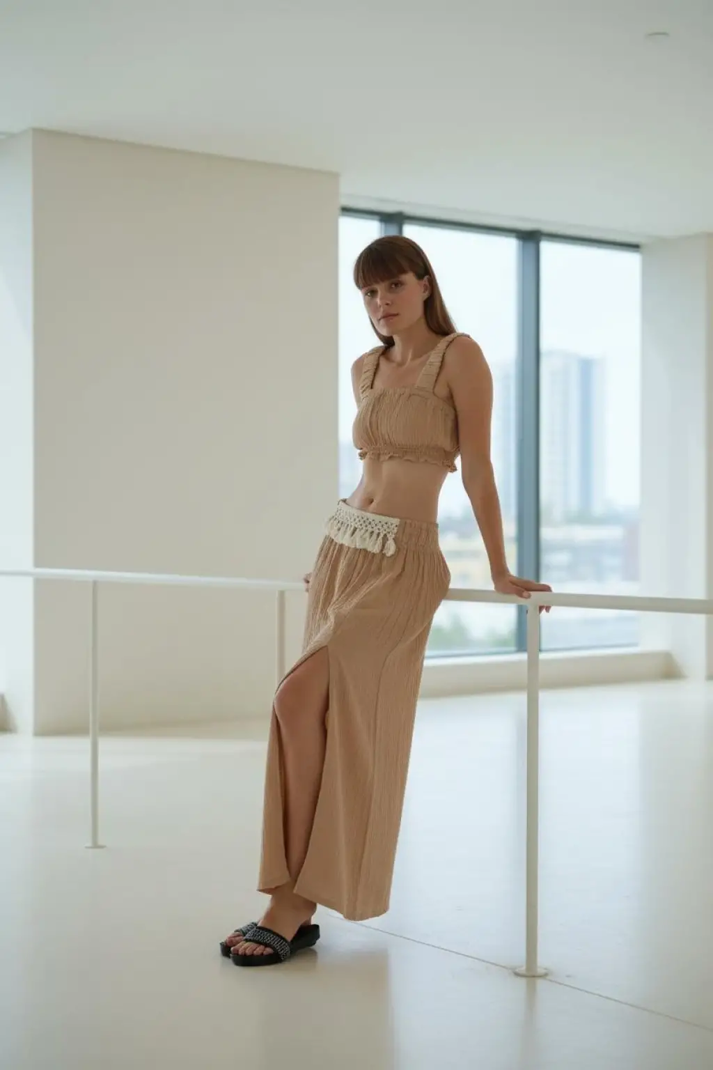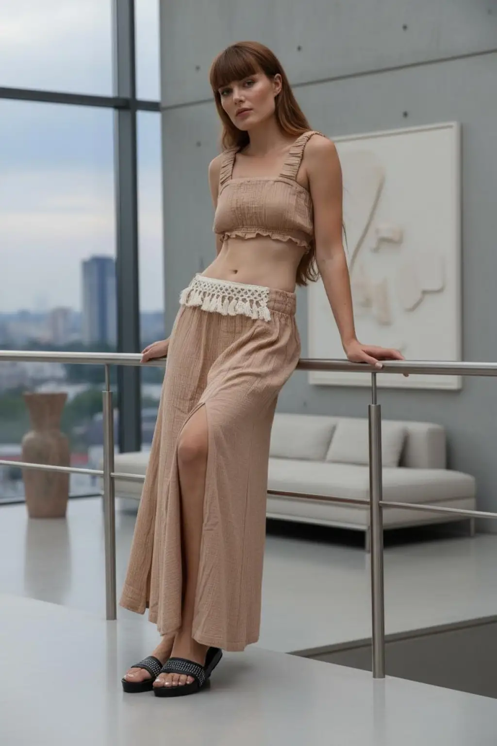 Müslin , Dantel Kumaş Detaylı Düz Kesim Etek ve Askılı Crop