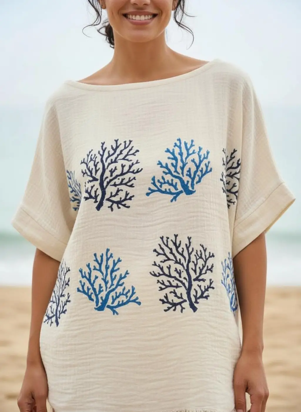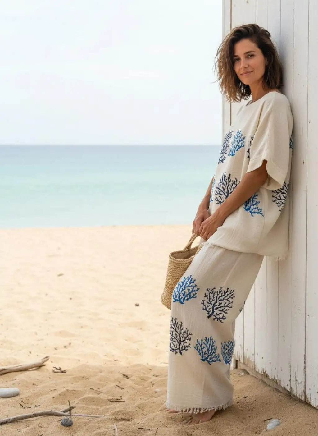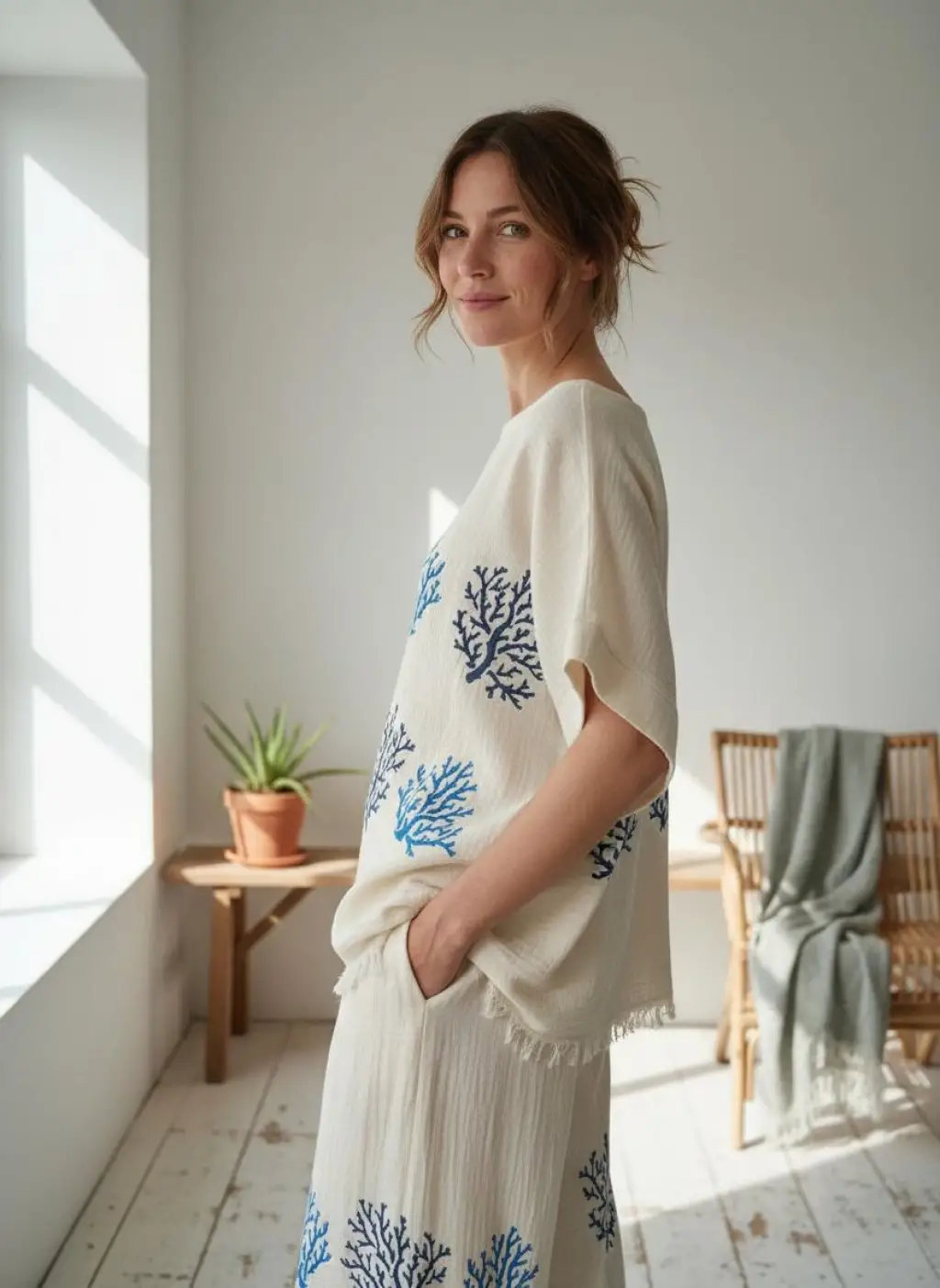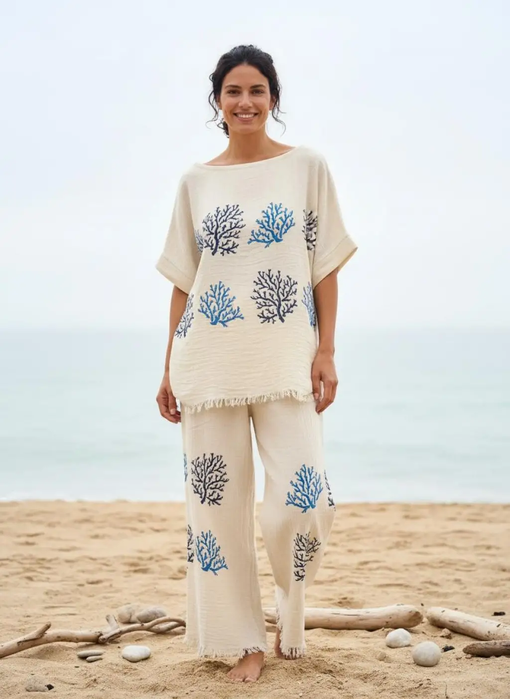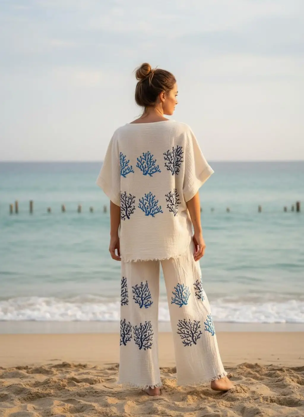 El Baskılı mercan deseni, yumuşacık krinkil dokusu ile doğal ve nefes alan bir takım