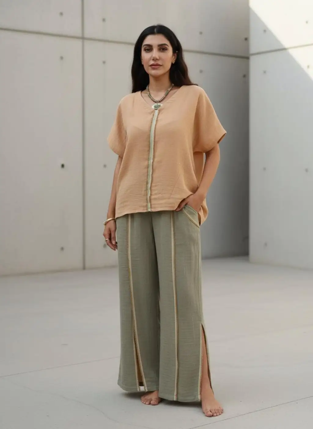 MİDYAT V YAKA PÜSKÜL DETAYLI MÜSLİN BLUZ / Keten