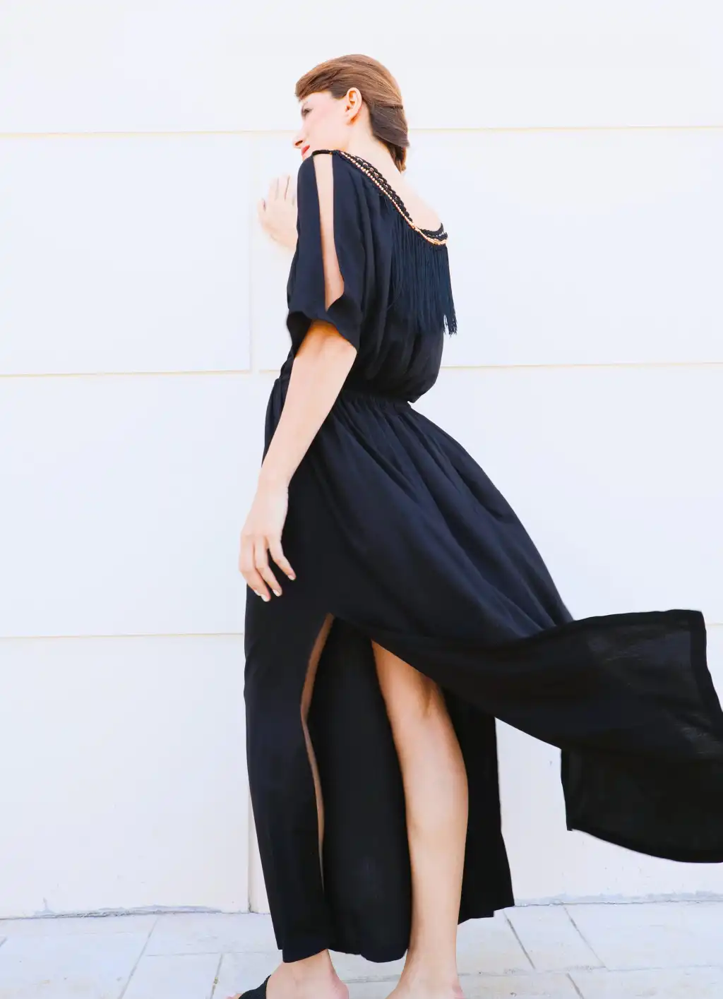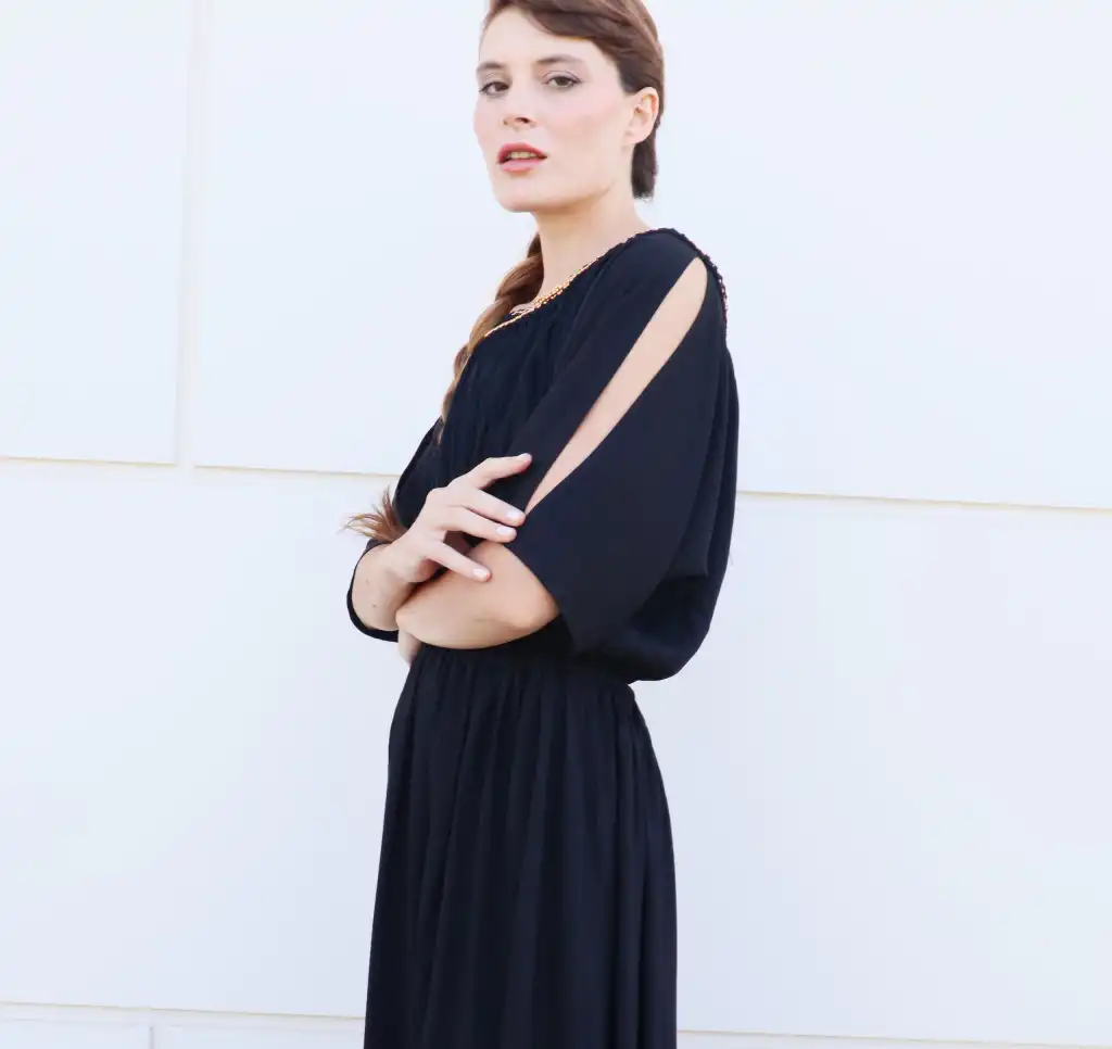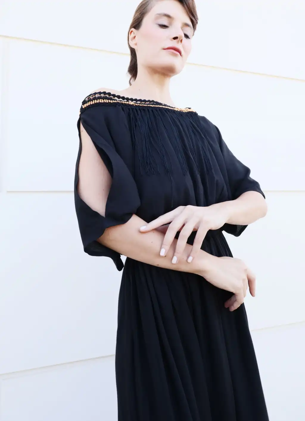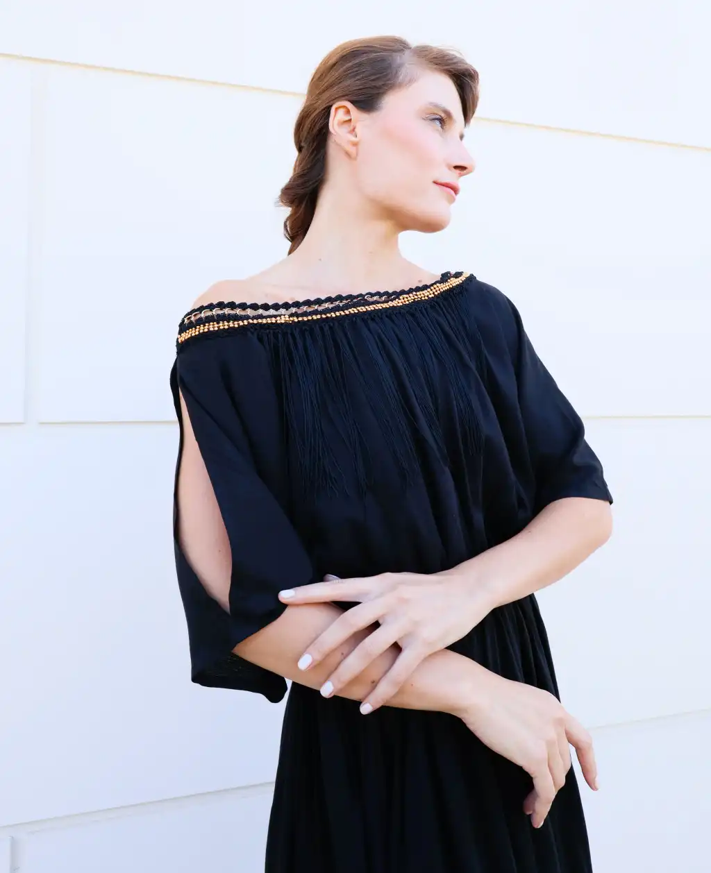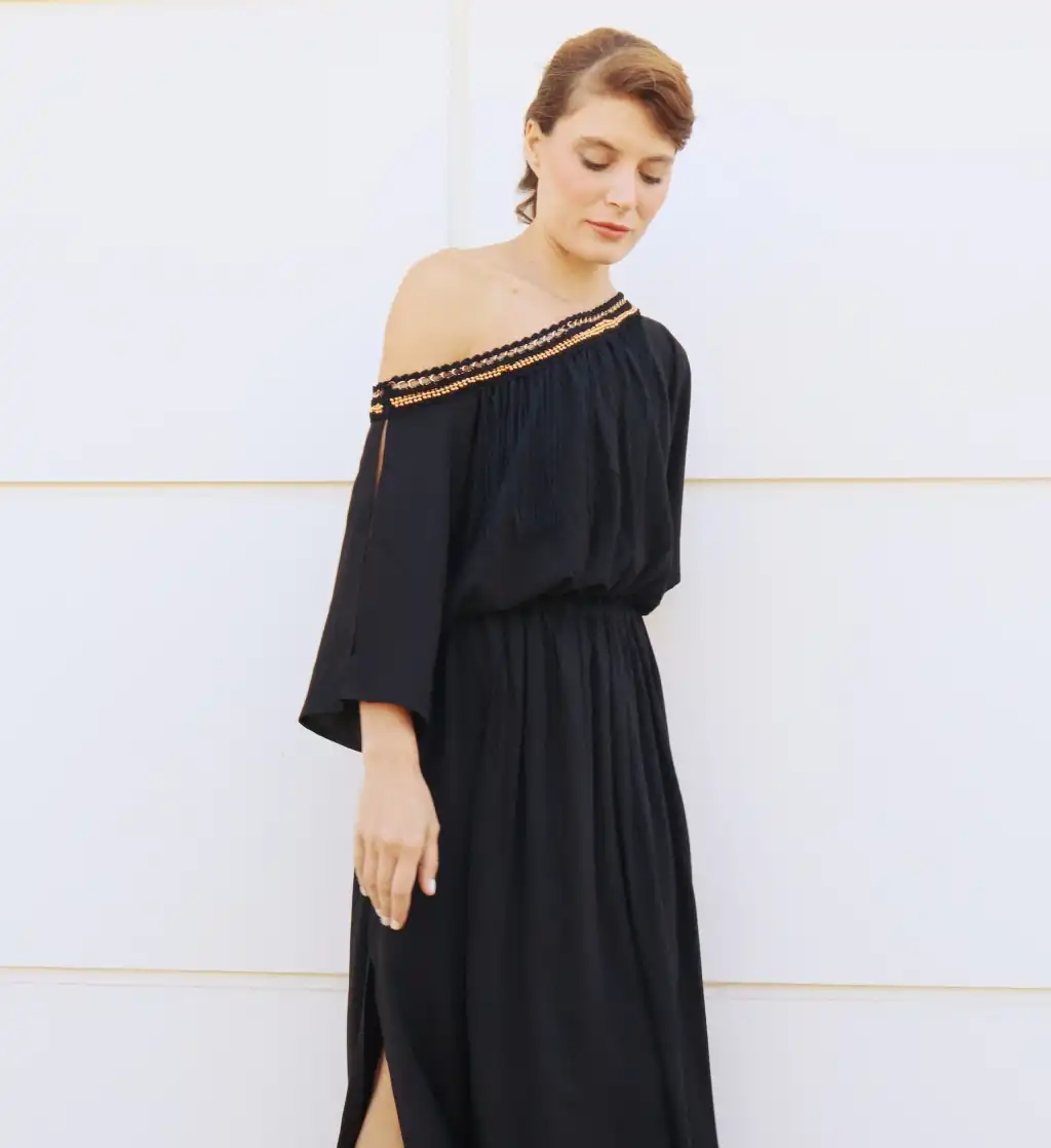 Nefertiti <Şile Bezi Elbisemizin Yakası el işi boncuklu tığ işi püskül detaylı,