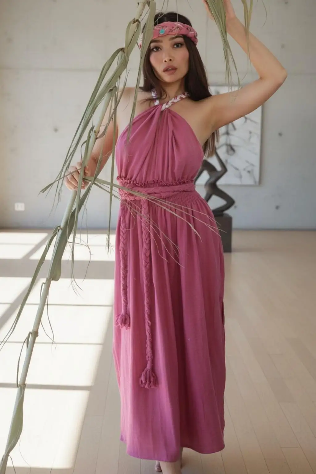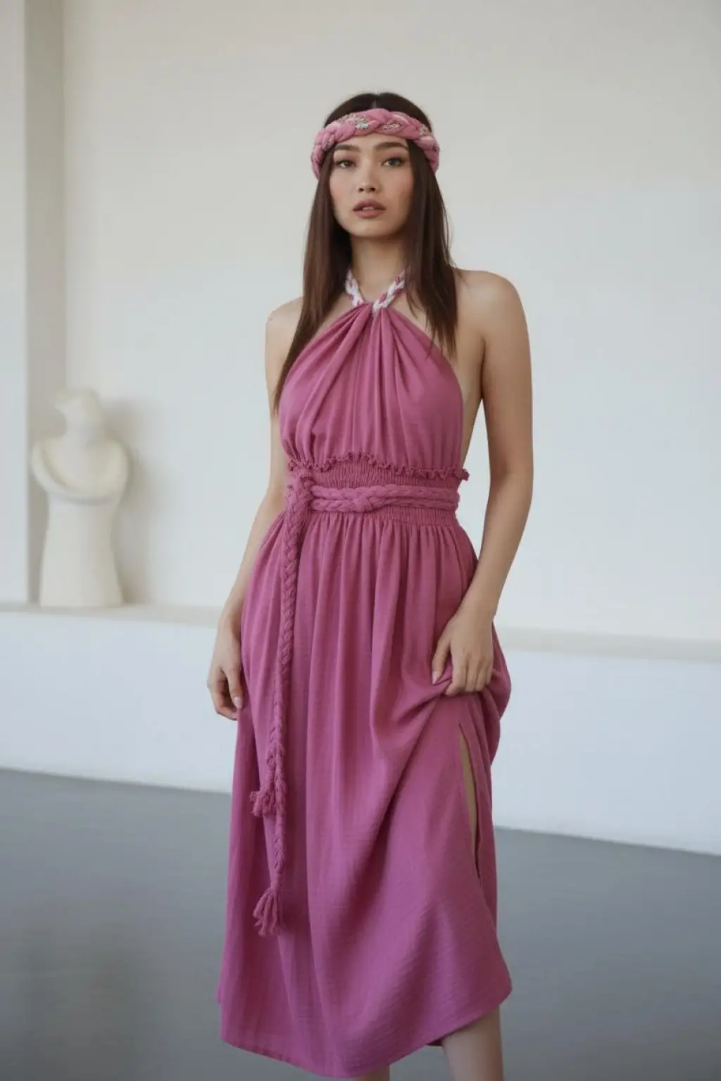 benzersiz dokuması sırt dekoltesi ve el örgü kemer detayı ile öne çıkan elbisemiz, geniş beden aralığına uyum sağlar.