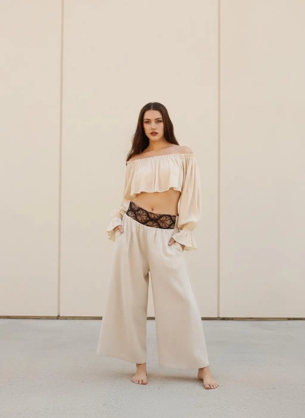 Sarka Pantolon keten kumaşı ve kilim bel detayı ile göz dolduruyor.