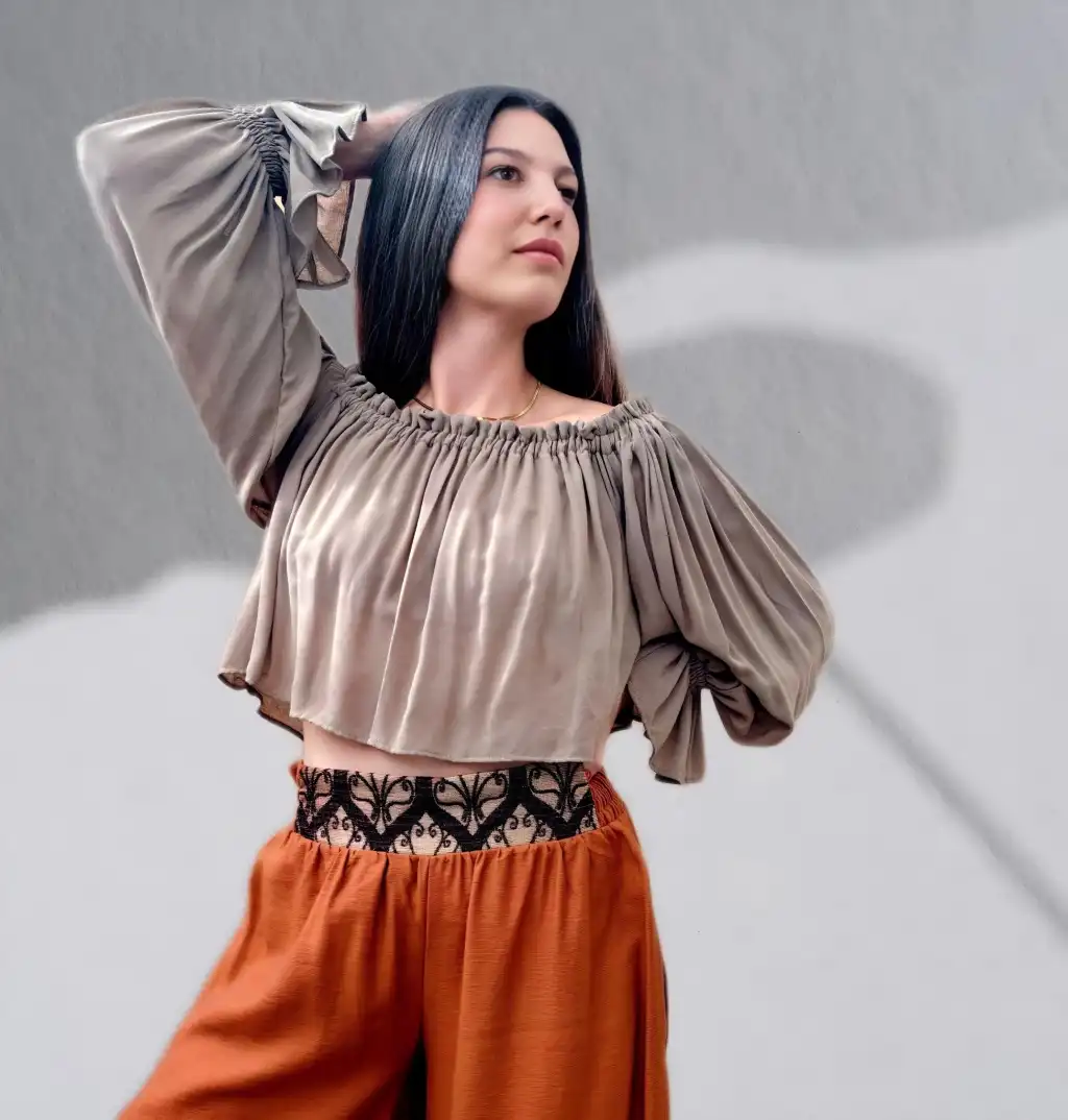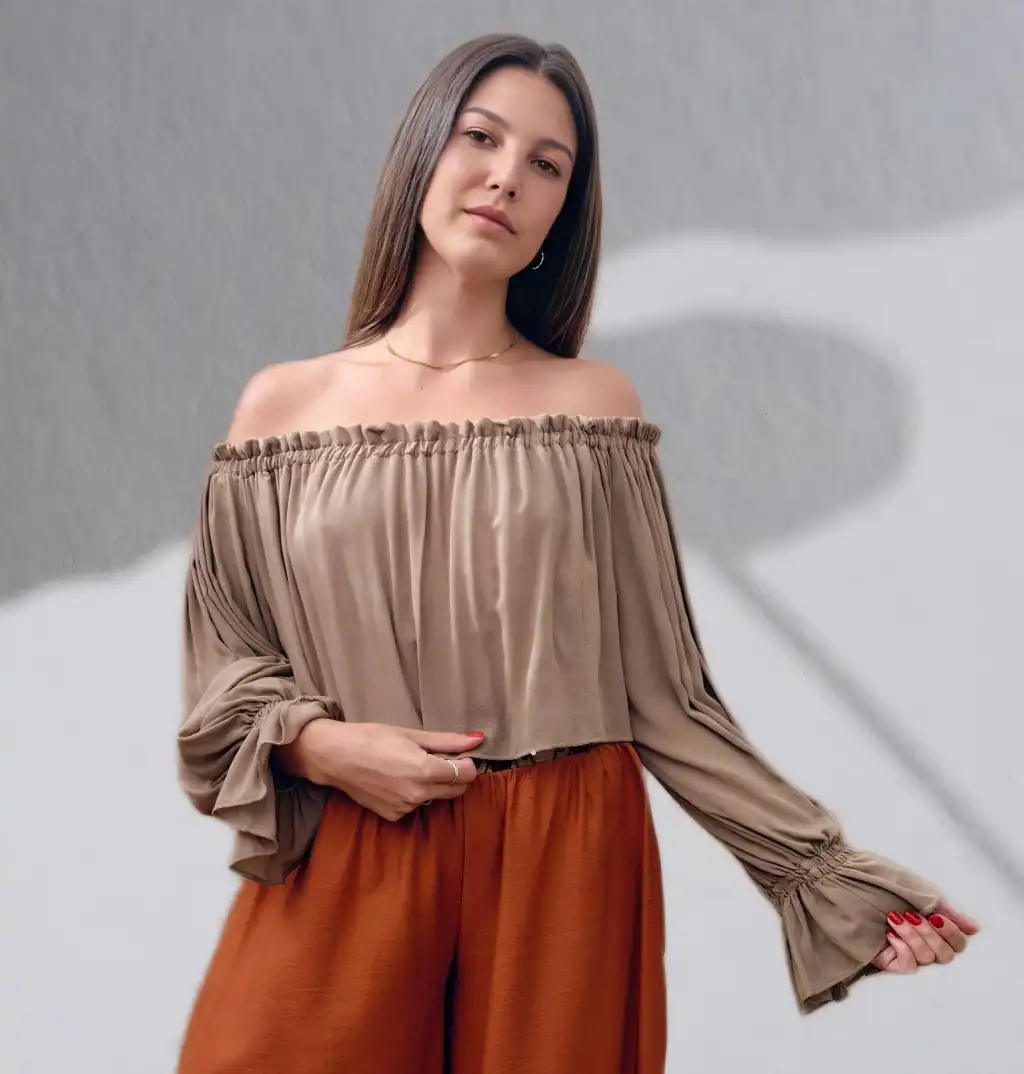 Fırfır Kollu Viskon Madonna Yaka Crop Bluz