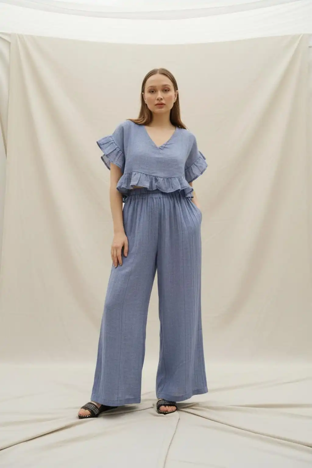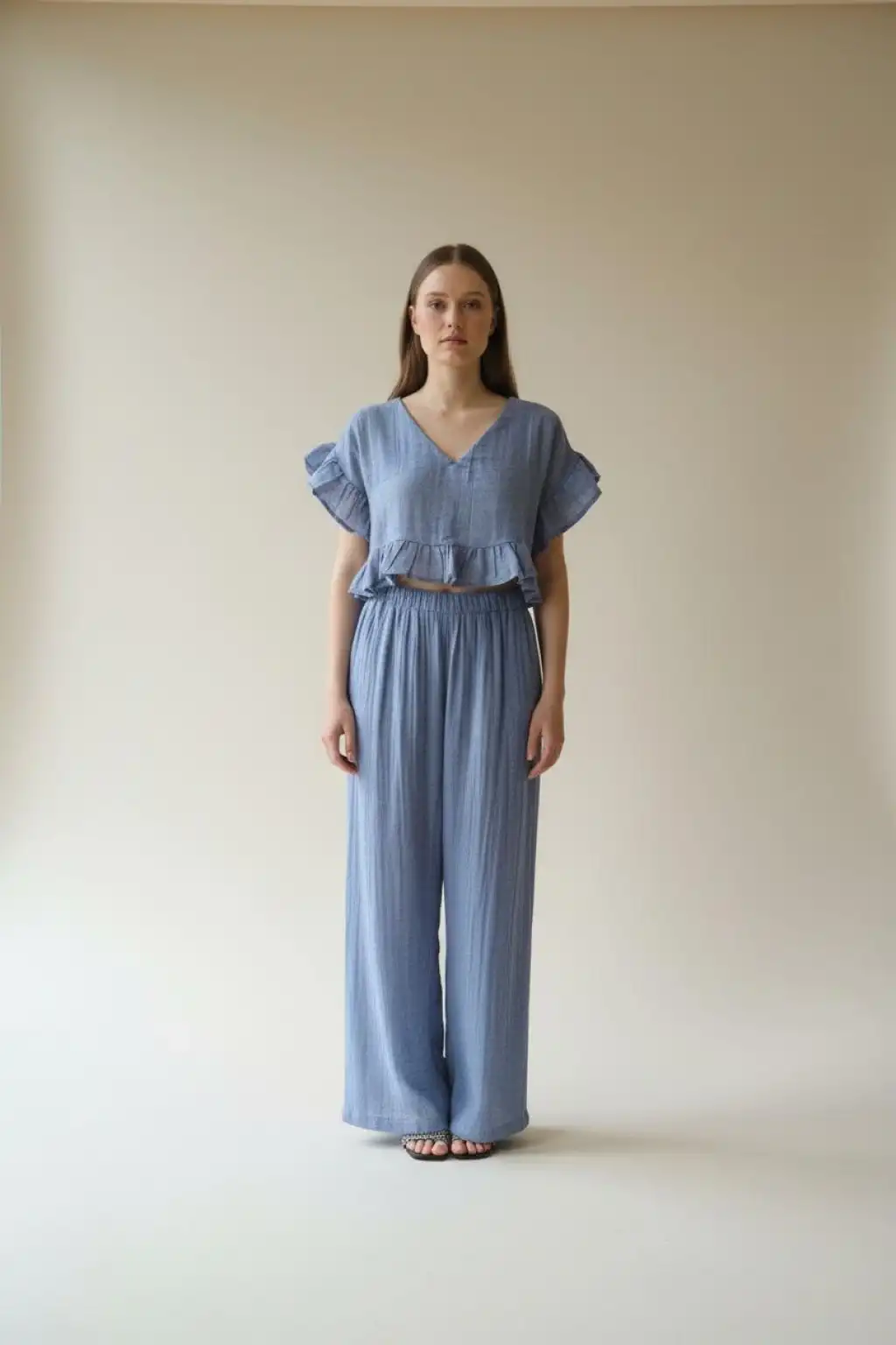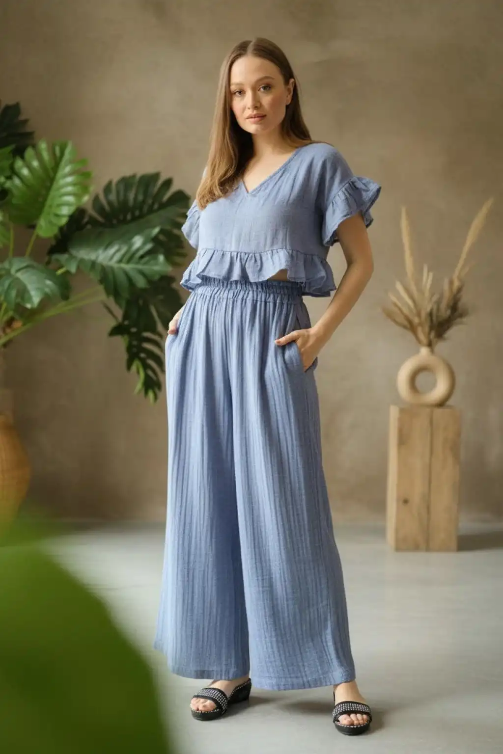 Müslin Fırfır Kollu Bluz & Bol Paça Pantolon Takım