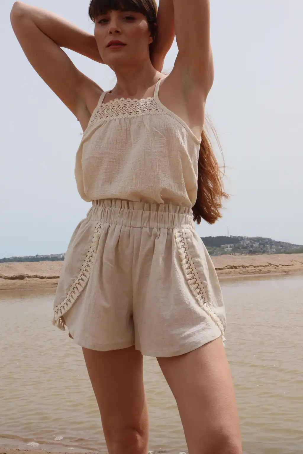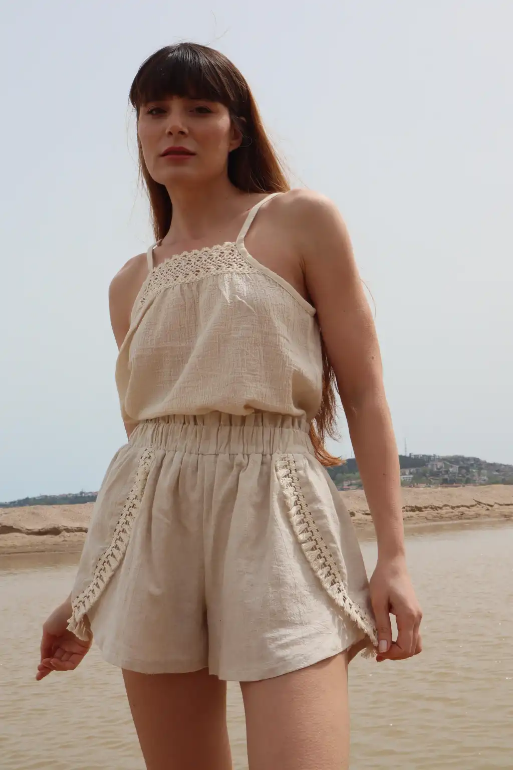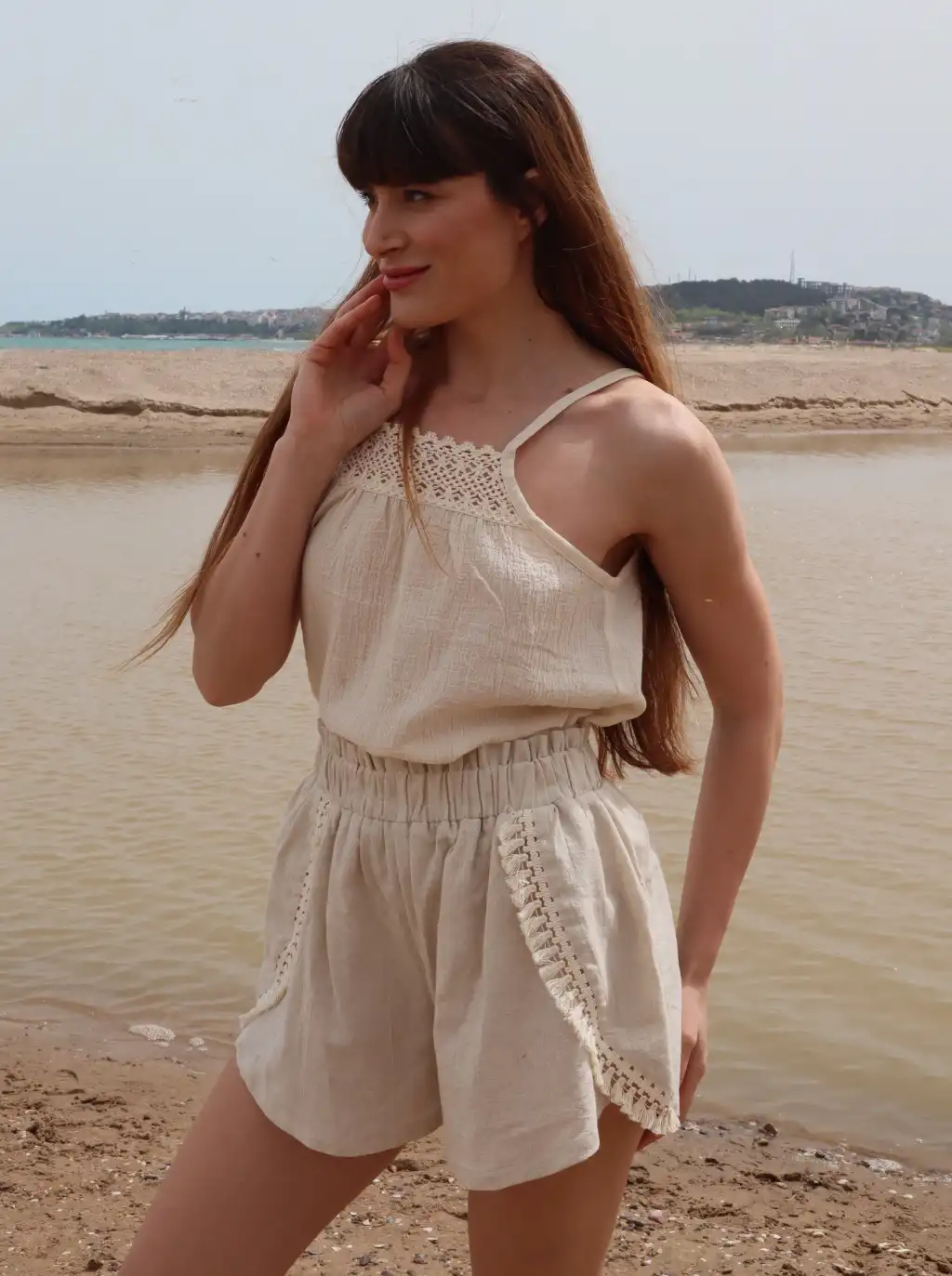 Pamuk Şİle Bezi askılı bluz yakasındaki dantel detayı, keten karışımlı pamuk şortu ise pamuk püskülleri ile dikkat çekiyor.