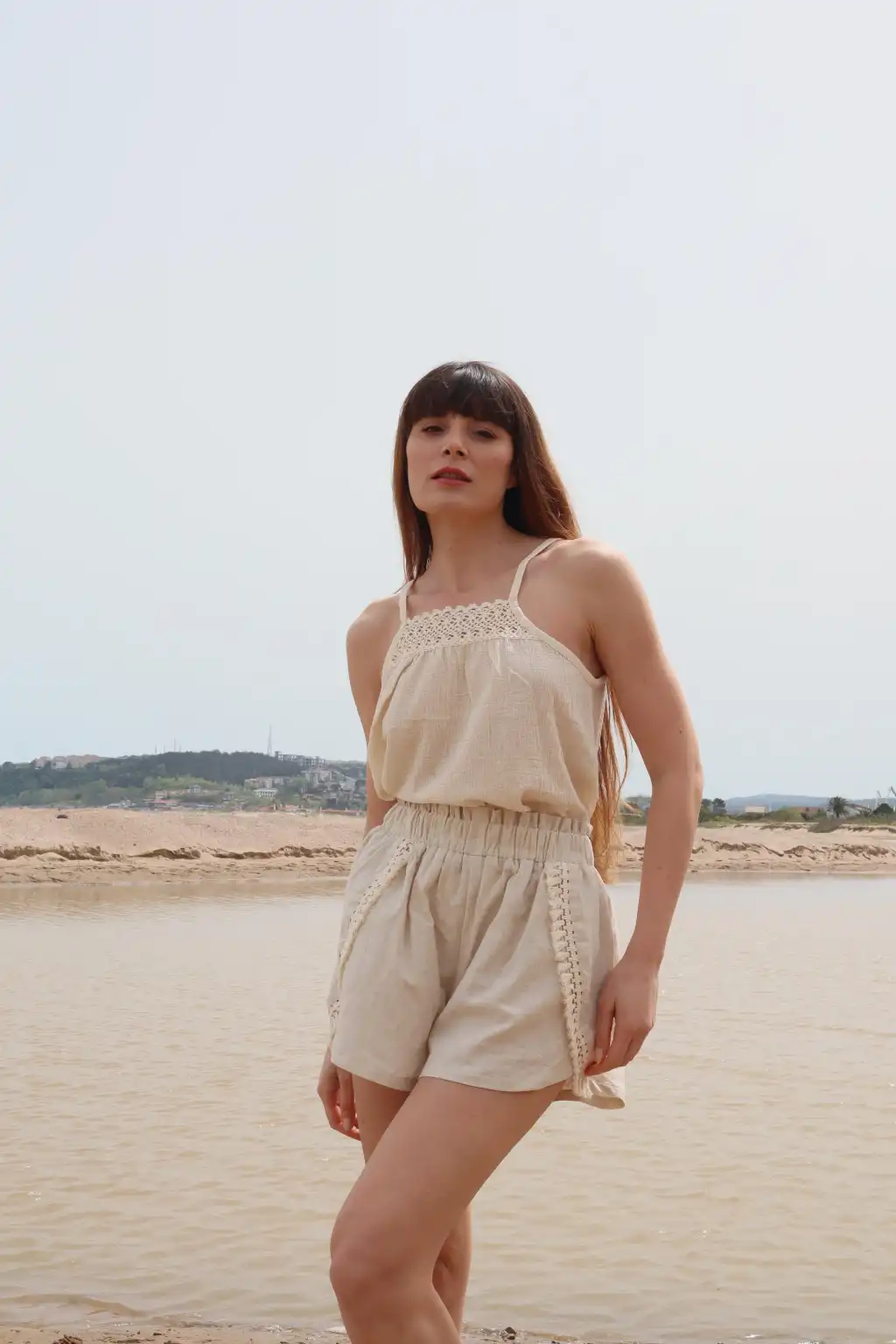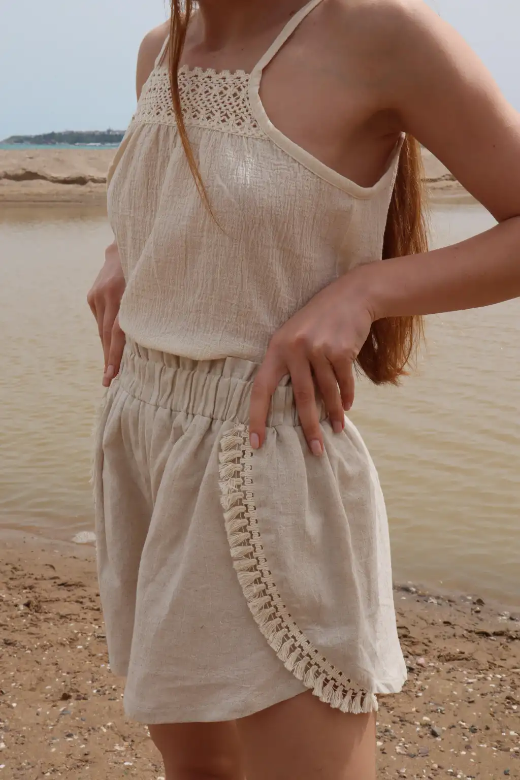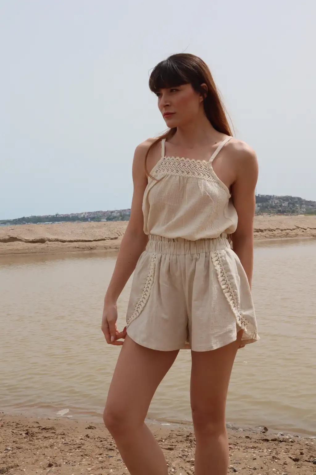 Pamuk Şİle Bezi askılı bluz yakasındaki dantel detayı, keten karışımlı pamuk şortu ise pamuk püskülleri ile dikkat çekiyor.