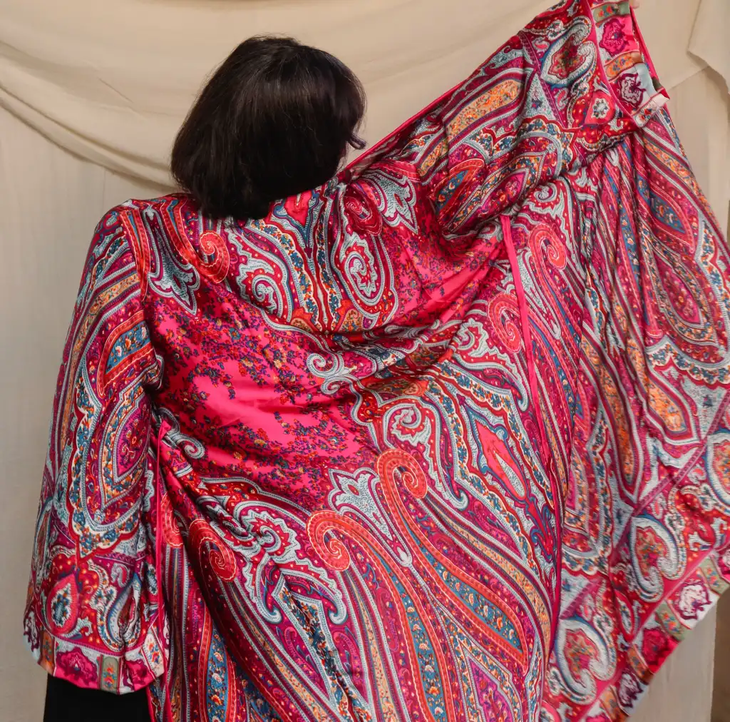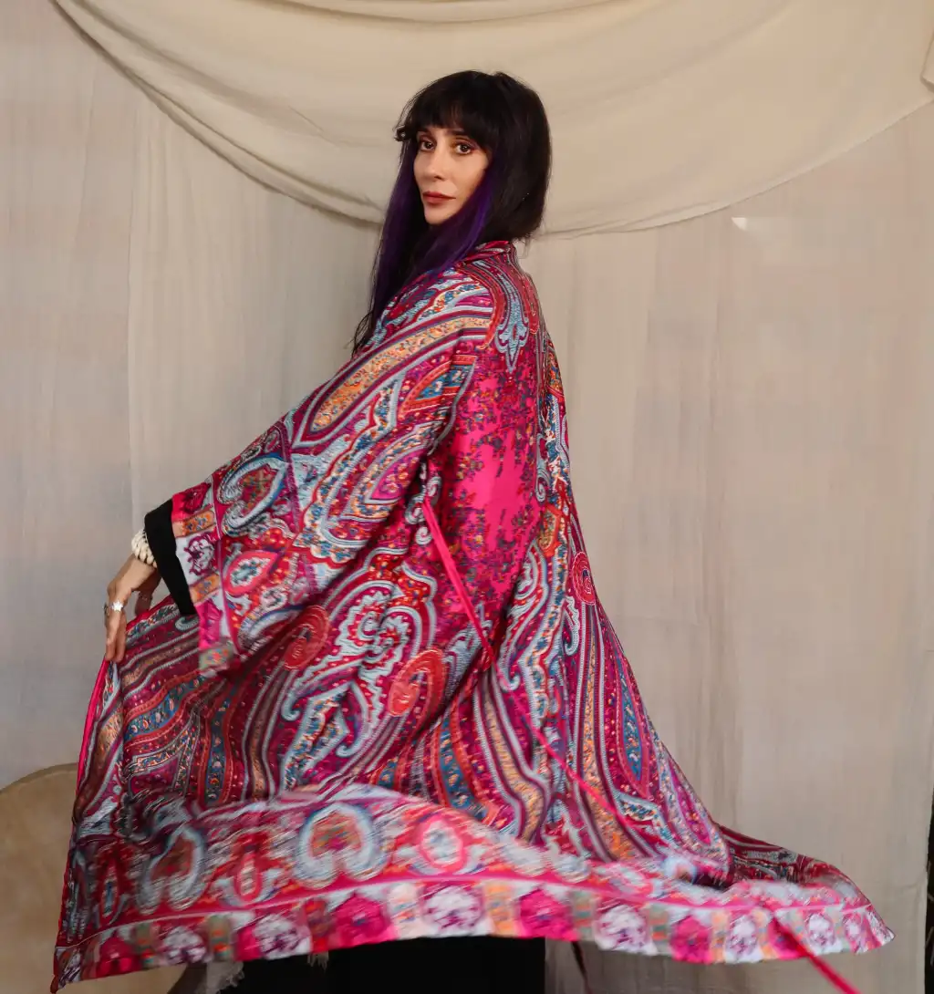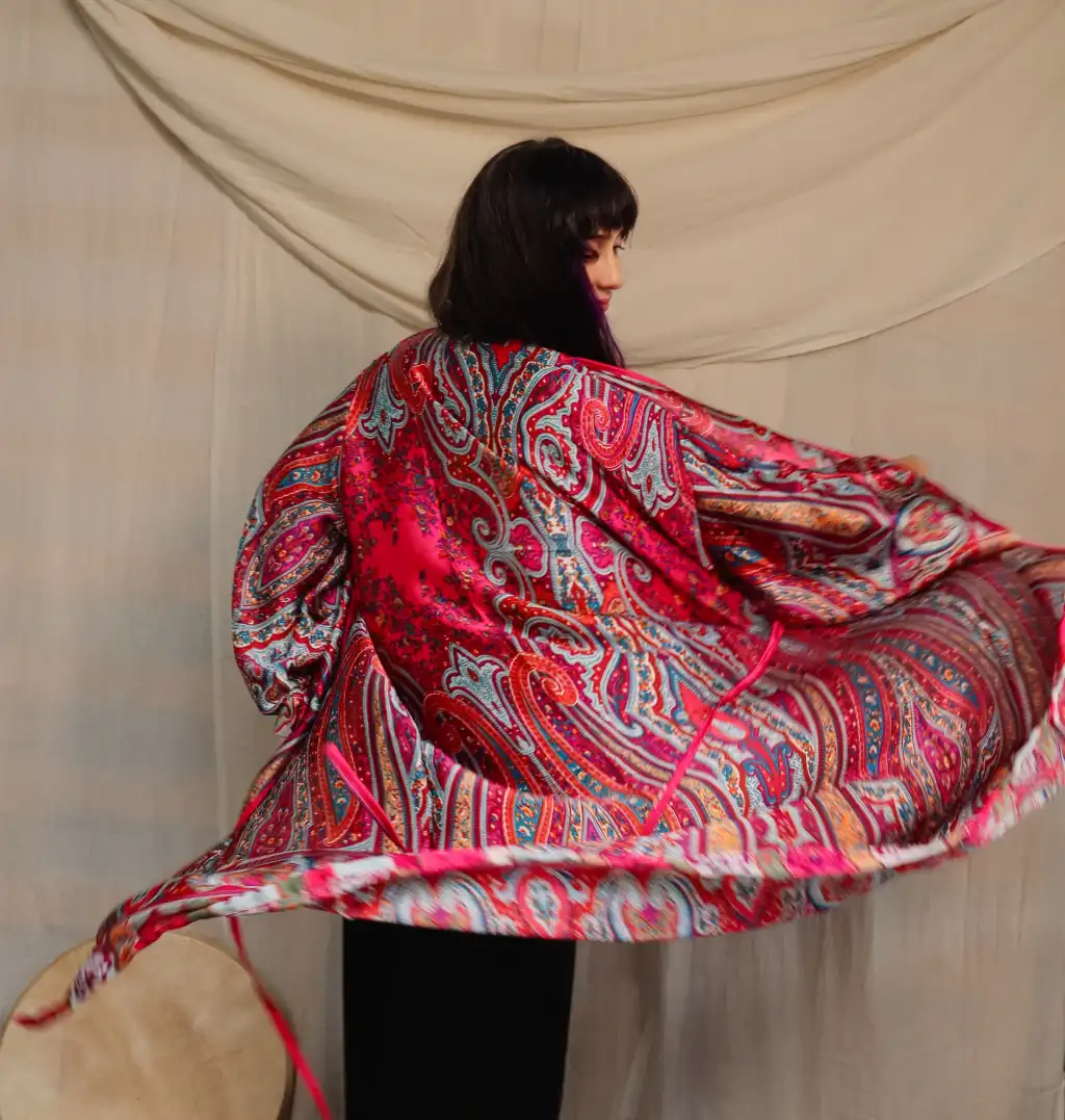 Şal desenli, Akışkan hint ipeği Silk Road Kimono 44 bedene kadar olan oversize kalıptır.